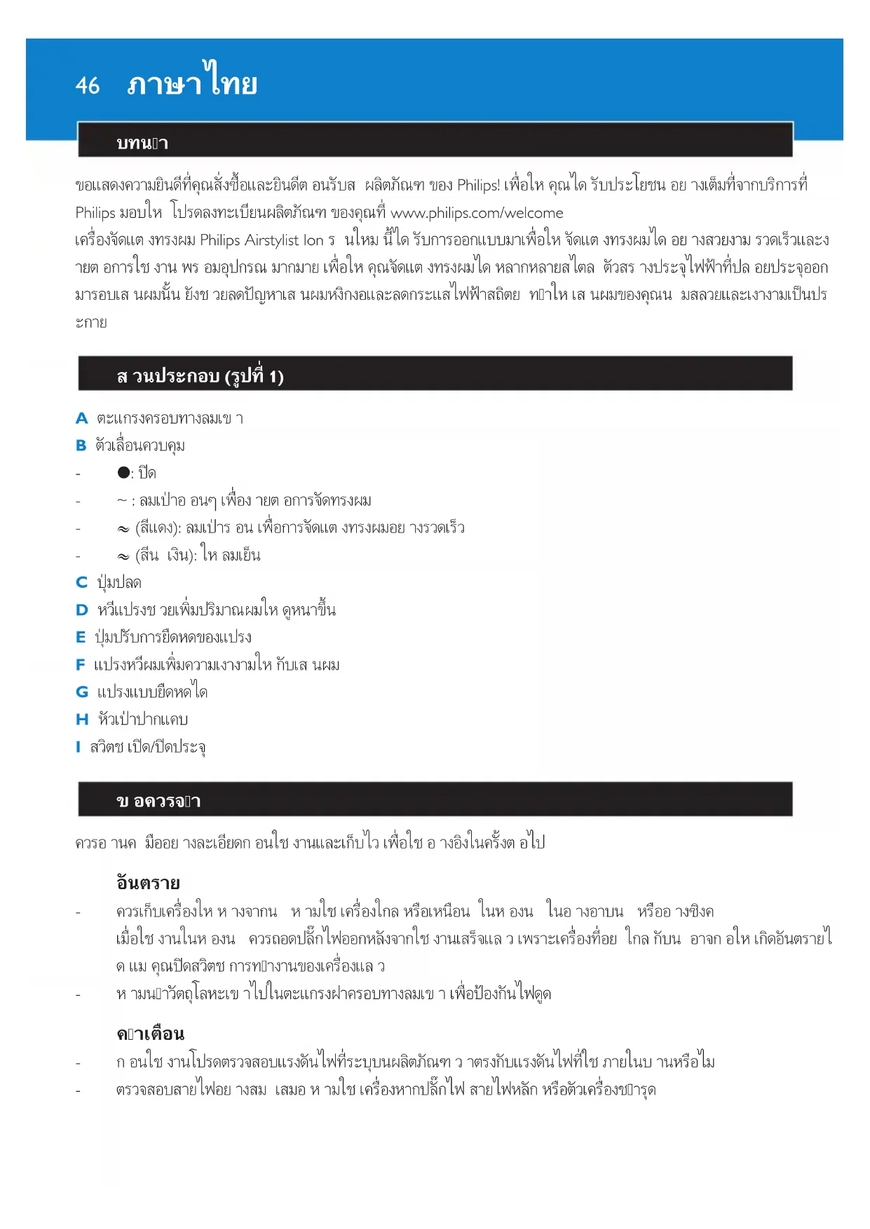 ภาษาไทยหากสายไฟชำรุด ควรนำไปเปลี่ยนที่บริษัทฟลิปส หรือศูนยบริการที่ไดรับอนุญาตจากฟลิปส หรือบุคคลที่ผานการอบ