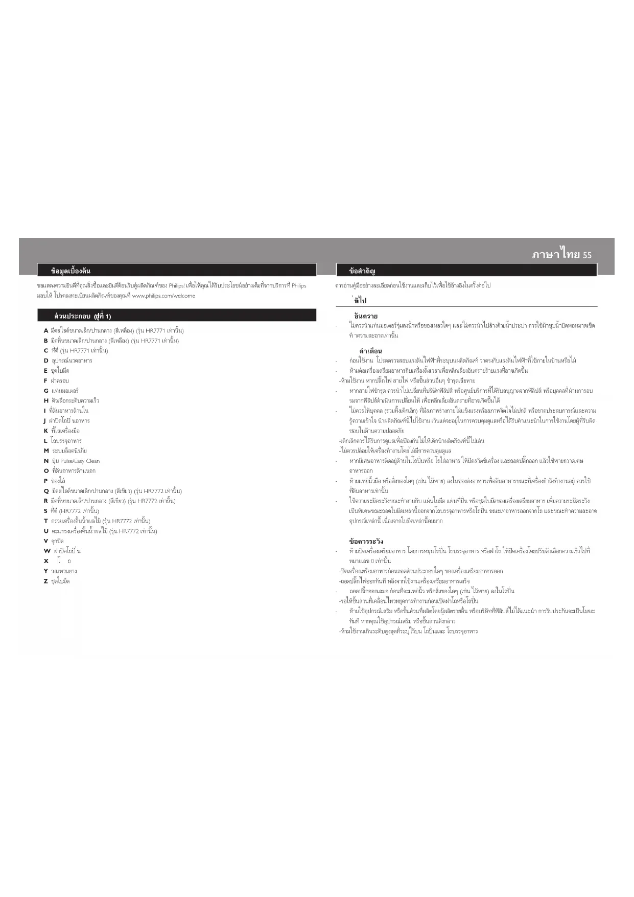 - หามใชอุปกรณเสริม หรือชิ้นสวนที่ผลิตโดยผูผลิตรายอื่น หรือบริษัทที่ฟลิปสไมไดแนะนํา การรับประกันจะเปนโมฆะ