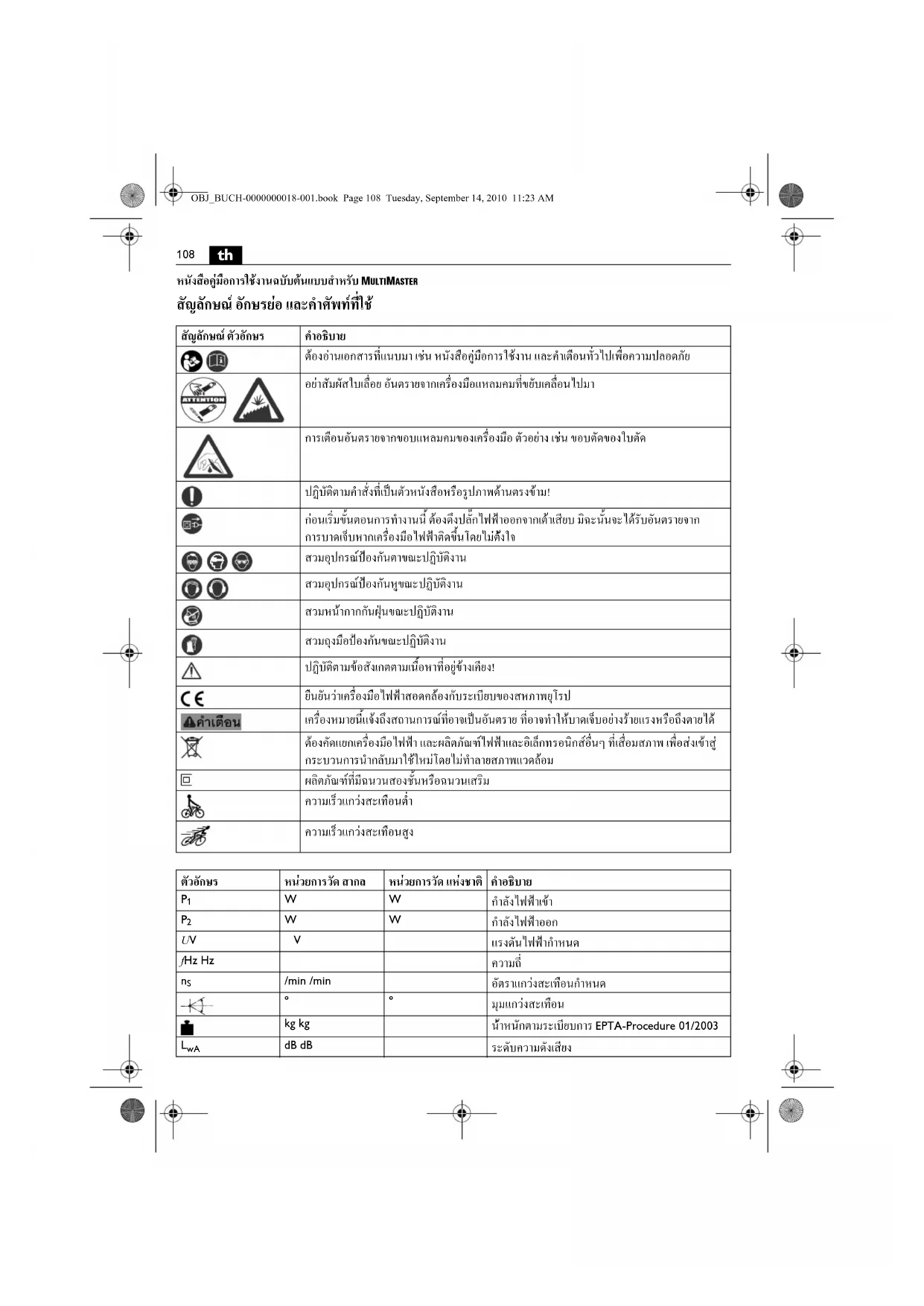 หนังสือคูมือการใชงานฉบับตนแบบสําหรับ MULTIMASTER สัญลักษณ อักษรยอ และคําศัพทที่ใช สัญลักษณ ตัวอักษร คําอธิบาย ตองอานเอกสารที่แนบมา เชน หนังสือคูมือการใชงาน และคําเตือนทั่วไปเพื่อความปลอดภัย อยาสัมผัสใบเลื่อย อันตรายจากเครื่องมือแหลมคมที่ขยับเคลื่อนไปมา การเตือนอันตรายจากขอบแหลมคมของเครื่องมือ ตัวอยาง เชน ขอบตัดของใบตัด ปฏิบัติตามคําสั่งที่เปนตัวหนังสือหรือรูปภาพดานตรงขาม! กอนเริ่มขั้นตอนการทํางานนี้ ตองดึงปลั๊กไฟฟาออกจากเตาเสียบ มิฉะนั้นจะไดรับอันตรายจาก การบาดเจ็บหากเครื่องมือไฟฟาติดขึ้นโดยไมตั งใจ สวมอุปกรณปองกันตาขณะปฏิบัติงาน สวมอุปกรณปองกันหูขณะปฏิบัติงาน สวมหนากากกันฝุนขณะปฏิบัติงาน สวมถุงมือปองกันขณะปฏิบัติงาน ปฏิบัติตามขอสังเกตตามเนื้อหาที่อยูขางเคียง! ยืนยันวาเครื่องมือไฟฟาสอดคลองกับระเบียบของสหภาพยุโรป เครื่องหมายนี้แจงถึงสถานการณที ่อาจเปนอันตราย ที่อาจทําใหบาดเจ็บอยางรายแรงหรือถึงตายได ตองคัดแยกเครื่องมือไฟฟา และผลิตภัณฑไฟฟาและอิเล็กทรอนิกสอื่นๆ ที่เสื่อมสภาพ เพื่อสงเขาสู กระบวนการนํากลับมาใชใหมโดยไมทําลายสภาพแวดล อม ผลิตภัณฑที่มีฉนวนสองชั้นหรือฉนวนเสริม ความเร็วแกวงสะเทือนต่ํา ความเร็วแกวงสะเทือนสูง ตัวอักษร หนวยการวัด สากล หนวยการวัด แหงชาติ คําอธิบาย