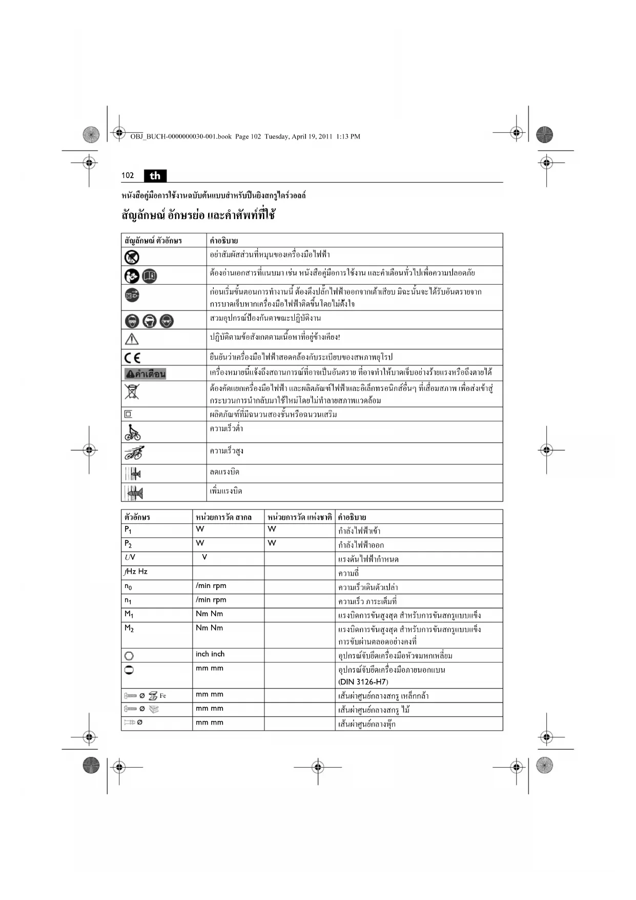 หนังสือคูมือการใชงานฉบับตนแบบสําหรับปนยิงสกรูไดรวอลล สัญลักษณ อักษรยอ และคําศัพทที่ใช สัญลักษณ ตัวอักษร คําอธิบาย อยาสัมผัสสวนที่หมุนของเครื่องมือไฟฟา ตองอานเอกสารที่แนบมา เชน หนังสือคูมือการใชงาน และคําเตือนทั่วไปเพื่อความปลอดภัย กอนเริ่มขั้นตอนการทํางานนี้ ตองดึงปลั๊กไฟฟาออกจากเตาเสียบ มิฉะนั้นจะไดรับอันตรายจาก การบาดเจ็บหากเครื่องมือไฟฟาติดขึ้นโดยไมตั งใจ สวมอุปกรณปองกันตาขณะปฏิบัติงาน ปฏิบัติตามขอสังเกตตามเนื้อหาที ่อยูขางเคียง! ยืนยันวาเครื่องมือไฟฟาสอดคลองกับระเบียบของสหภาพยุโรป เครื่องหมายนี้แจงถึงสถานการณที่อาจเปนอันตราย ที่อาจทําใหบาดเจ็บอยางรายแรงหรือถึงตายได ตองคัดแยกเครื่องมือไฟฟา และผลิตภัณฑไฟฟาและอิเล็กทรอนิกสอื่นๆ ที่เสื่อมสภาพ เพื่อสงเขาสู กระบวนการนํากลับมาใชใหมโดยไมทําลายสภาพแวดล อม ผลิตภัณฑที่มีฉนวนสองชั้นหรือฉนวนเสริม ความเร็วต่ํา