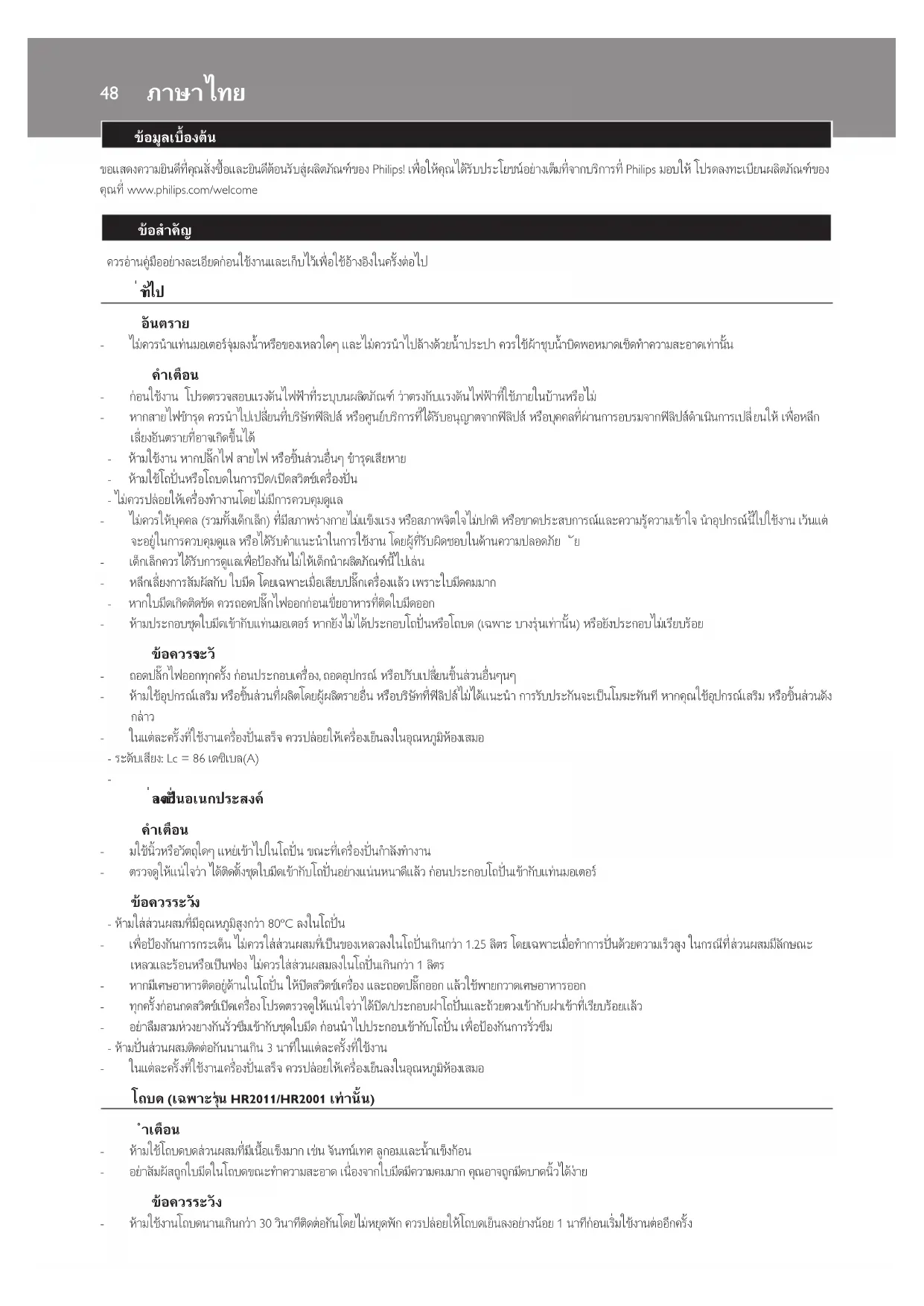 - หากสายไฟชํารุด ควรนําไปเปลี่ยนที่บริษัทฟลิปส หรือศูนยบริการที่ไดรับอนุญาตจากฟลิปส หรือบุคคลที่ผานการอบรมจากฟลิปสดําเนินการเปลี
