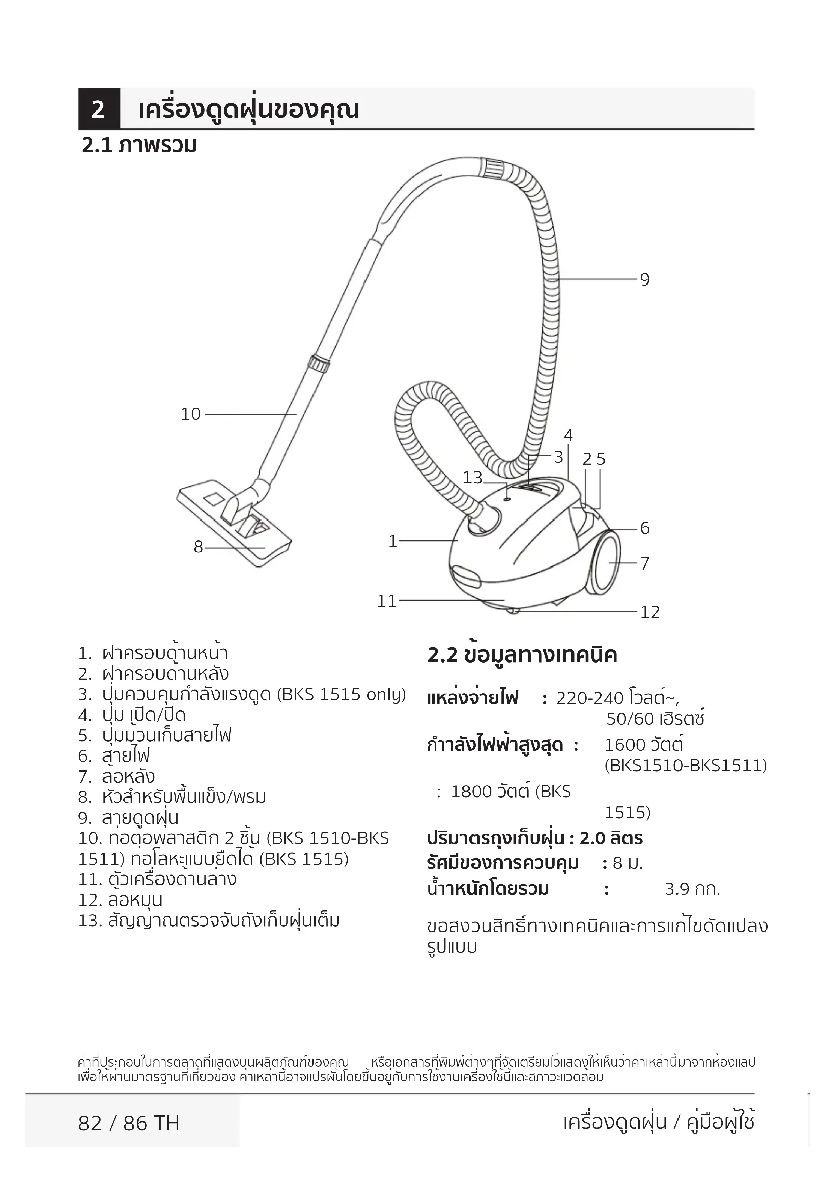 1 คำาแนะนำาด้านความปลอดภัยและสิ่งแวดล้อมที่สำาคัญ82 / 86 TH เครื่องดูดฝุ่น / คู่มือผู้ใช้ 2.1ภาพรวม ค่าที่ประกอบในการตลาดที่แสดงบนผลิตภัณฑ์ของคุณ หรือเอกสารที่พิมพ์ต่างๆที่จัดเตรียมไว้แสดงให้เห็นว่าค่าเหล่านี้มาจากห้องแลป เพื่อให้ผ่านมาตรฐานที่เกี่ยวข้อง ค่าเหล่านี้อาจแปรผันโดยขึ้นอยู่กับการใช้งานเครื่องใช้นี้และสภาวะแวดล้อม 2 เครื่องดูดฝุ่นของคุณ