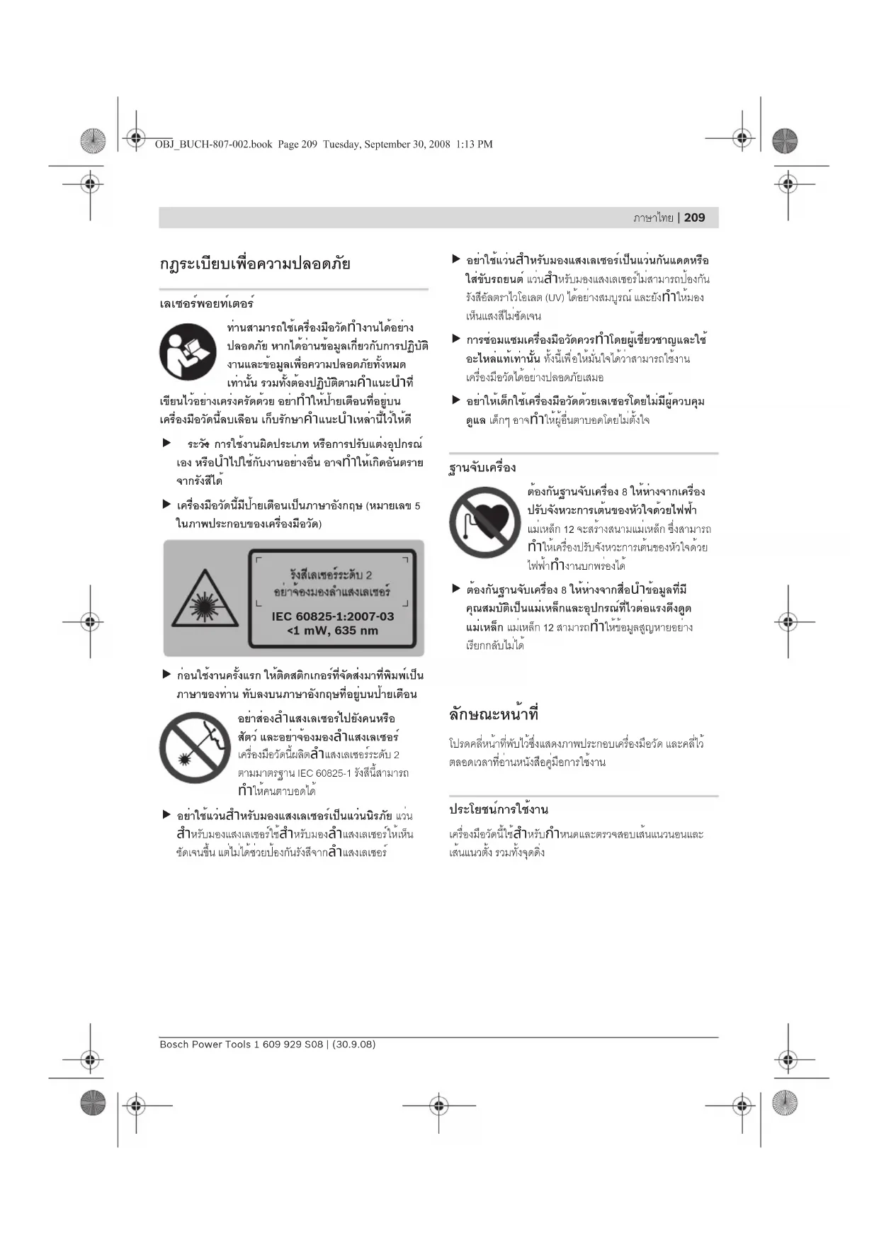 ดเจนขึ้น แต่ไม่ได้ช่วยป้องกันรังสีจากลำแสงเลเซอร์ f อย่าใช้แว่นสำหรับมองแสงเลเซอร์เป็นแว่นกันแดดหรือ ใส่ขับรถยนต์ แว่นสำหรับมองแสงเลเซอร์ไม่สามารถป้องกัน รังสีอัลตราไวโอเลต (UV) ได้อย่างสมบูรณ์ และยังทำให้มอง เห็นแสงสีไม่ชัดเจน การบำรุงรักษาและการบริการ การบำรุงรักษาและการทำความสะอาด เก็บรักษาและขนย้ายเครื่องมือวัดเฉพาะเมื่อบรรจุอยู่ภายใน กระเป๋าใส่เครื่องมือวัดที่จัดมาให้เท่านั้น รักษาเครื่องมือวัดให้สะอาดตลอดเวลา อย่าจุ่มเครื่องมือวัดลงในน้ำหรือของเหลวอื่นๆ เช็ดสิ่งสกปรกออกด้วยผ้านุ่มที่เปียกหมาดๆ ห้ามใช้สารทำ ความสะอาดหรือสารละลายใดๆ ทำความสะอาดพื้นผิวตรงช่องทางออกลำแสงเลเซอร์เป็นประจำ และเอาใจใส่อย่าให้ขุยผ้าติด เครื่องมือวัดนี้ผ่านกรรมวิธีการผลิตและตรวจสอบอย่างละเอียด ถี่ถ้วนมาแล้ว ถึงกระนั้น หากเครื่องเกิดขัดข้อง ต้องส่งเครื่องให้ ศูนย์บริการหลังการขายที ่ได้รับมอบหมายสำหรับเครื่องมือไฟฟ้า บ๊อช ซ่อมแซม เมื่อต้องการสอบถามและสั่งซื้ออะไหล่ กรุณาแจ้งหมายเลขสินค้า 10 หลักบนแผ่นป้ายรุ่นของเครื่องมือวัดทุกครั้ง ในกรณีซ่อมแซม ให้ส่งเครื่องมือวัดโดยบรรจุลงในกระเป๋าใส่ เครื่องมือวัด 16 OBJ_BUCH-807-002.book Page 214 Tuesday, September 30, 2008 1:13 PMภาษาไทย | 215 Bosch Power Tools 1 609 929 S08 | (30.9.08) การบริการหลังการขายและการให้คำแนะนำลูกค้า ศูนย์บริการหลังการขายของเรายินดีตอบคำถามของท่านที่ เกี่ยวกับการบำรุงรักษาและการซ่อมแซมผลิตภัณฑ์รวมทั้งเรื่อง อะไหล่ ภาพขยายและข้อมูลเกี่ยวกับอะไหล่ กรุณาดูใน: www.bosch-pt.com แผนกให้คำปรึกษาลูกค้าของเราพร้อมให้คำแนะนำที่ดีที่สุดแก่ท่าน ในเรื่องการซื้อผลิตภัณฑ์ การใช้งานและการปรับแต่งผลิตภัณฑ์ และอุปกรณ์ประกอบต่างๆ ในกรณีประกัน ซ่อมแซม หรือซื้อชิ้นส่วนมาเปลี่ยน กรุณาติดต่อผู้ขายที่ได้รับแต่งตั้งเท่านั้น
