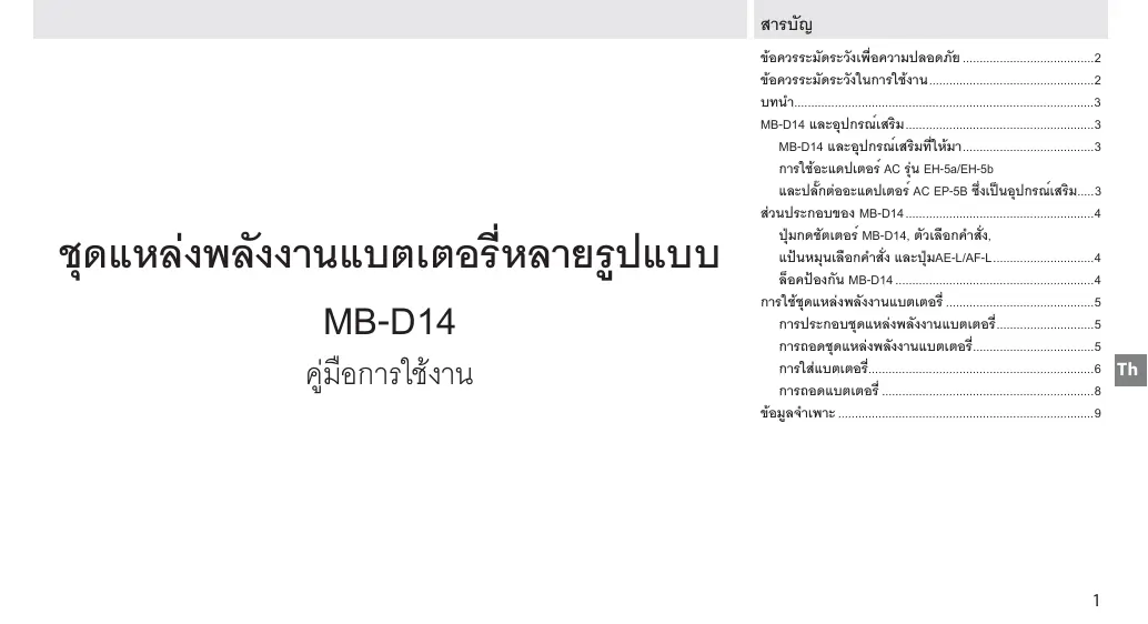 El disparador, el multiselector, los diales de control, y el botón AE-L/AF-L de la MB-D14 5 MB-D14 Bloqueo del control 5 Uso de la unidad de alimentación 6 Montaje de la unidad de alimentación 6 Extracción de la unidad de alimentación 6 Introducción de las baterías 7 Extracción de las baterías 9 Especificaciones 10