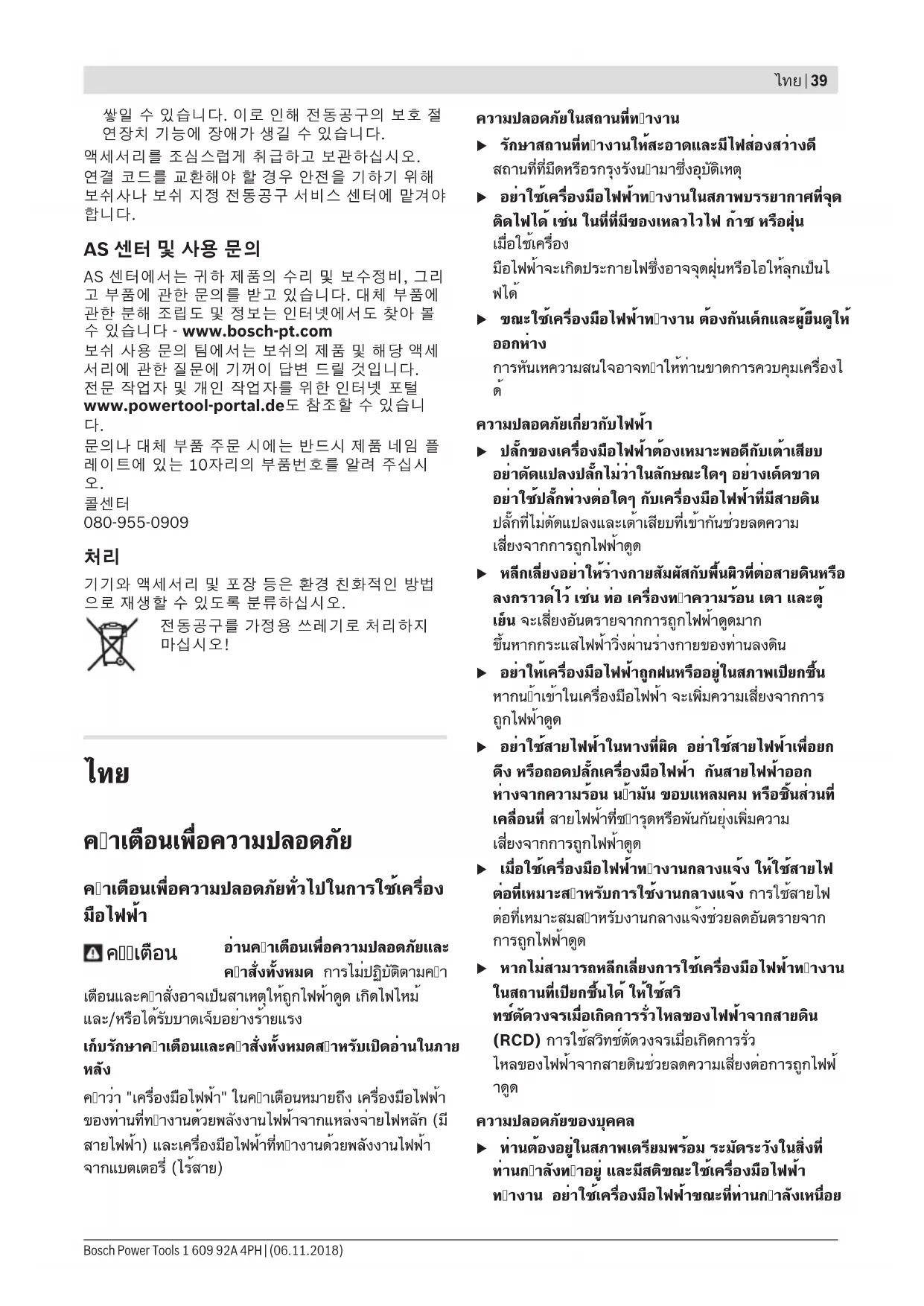 ศูนย์บริการหลังการขายของเรายินดีตอบคำถามของ ท่านที่เกี่ยวกับการบำรุงรักษาและการซ่อมแซมผลิตภัณฑ์รวม ทั้งเรื่องอะไหล่ ภาพแยกชิ้นและข้อมูลเกี่ยวกับอะไหล่ยัง สามารถดูได้ใน: www.bosch-pt.com ทีมงานที่ปรึกษาของ บ๊อช ยินดีให้ข้อมูลเกี่ยวกับผลิตภัณฑ์ ของเราและอุปกรณ์ประกอบต่างๆ www.powertool-portal.de เว็บพอร์ทัลสำหรับช่าง ฝีมือและช่างสมัครเล่น เมื่อต้องการสอบถามและสั่งซื้ออะไหล่ กรุณาแจ้งหมายเลข สินค้า 10 หลักบนแผ่นป้ายรุ่นของผลิตภัณฑ์ทุกครั้ง
