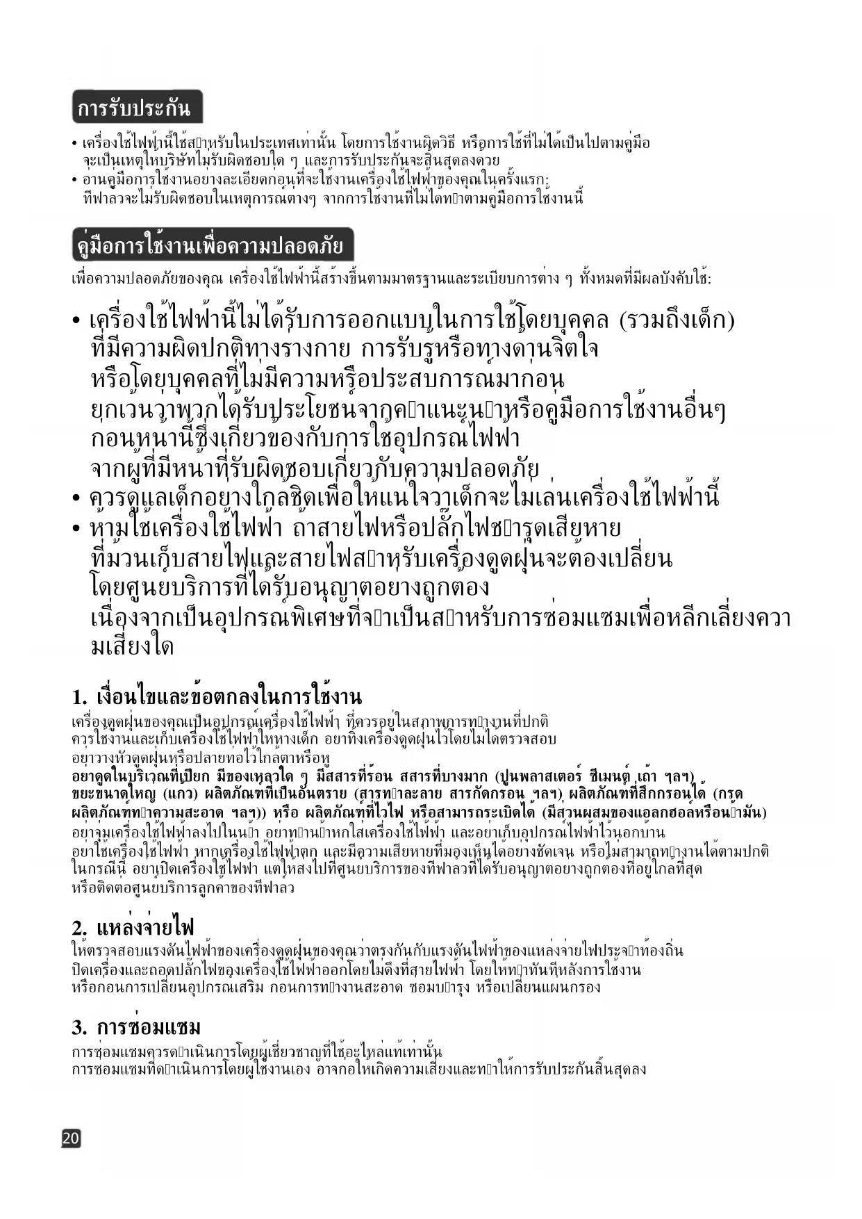 - ห้ามใช้เครื่องใช้ไฟฟ้า ถ้าสายไฟหรือปลั๊กไฟชำรุดเสียหาย ที่ม้วนเก็บสายไฟและสายไฟสำหรับเครื่องดูดฝุ่นจะต้องเปลี่ยน โดยศูนย์บริการที่ได้รับอนุญาตอย่างถูกต้อง เนื่องจากเป็นอุปกรณ์พิเศษที่จำเป็นสำหรับการซ่อมแซมเพื่อหลีกเลี่ยงควา