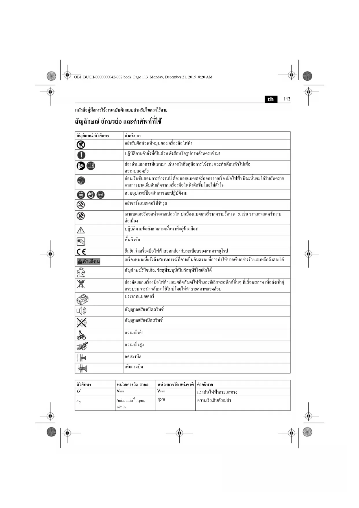 หนังสือคูมือการใชงานฉบับตนแบบสําหรับไขควงไรสาย สัญลักษณ อักษรยอ และคําศัพทที่ใช สัญลักษณ ตัวอักษร คําอธิบาย อยาสัมผัสสวนที่หมุนของเครื่องมือไฟฟา ปฏิบัติตามคําสั่งที่เปนตัวหนังสือหรือรูปภาพดานตรงขาม! ตองอานเอกสารที่แนบมา เชน หนังสือคูมือการใชงาน และคําเตือนทั่วไปเพื่อ ความปลอดภัย กอนเริ่มขั้นตอนการทํางานนี้ ตองถอดแบตเตอรี่ออกจากเครื่องมือไฟฟา มิฉะนั้นจะไดรับอันตราย จากการบาดเจ็บอันเกิดจากเครื่องมือไฟฟาติดขึ ้นโดยไมตั้งใจ สวมอุปกรณปองกันตาขณะปฏิบัติงาน อยาชารจแบตเตอรี่ที่ชํารุด เอาแบตเตอรี่ออกหางจากเปลวไฟ ปกปองแบตเตอรี่จากความรอน ต. ย. เชน จากแสงแดดจานาน