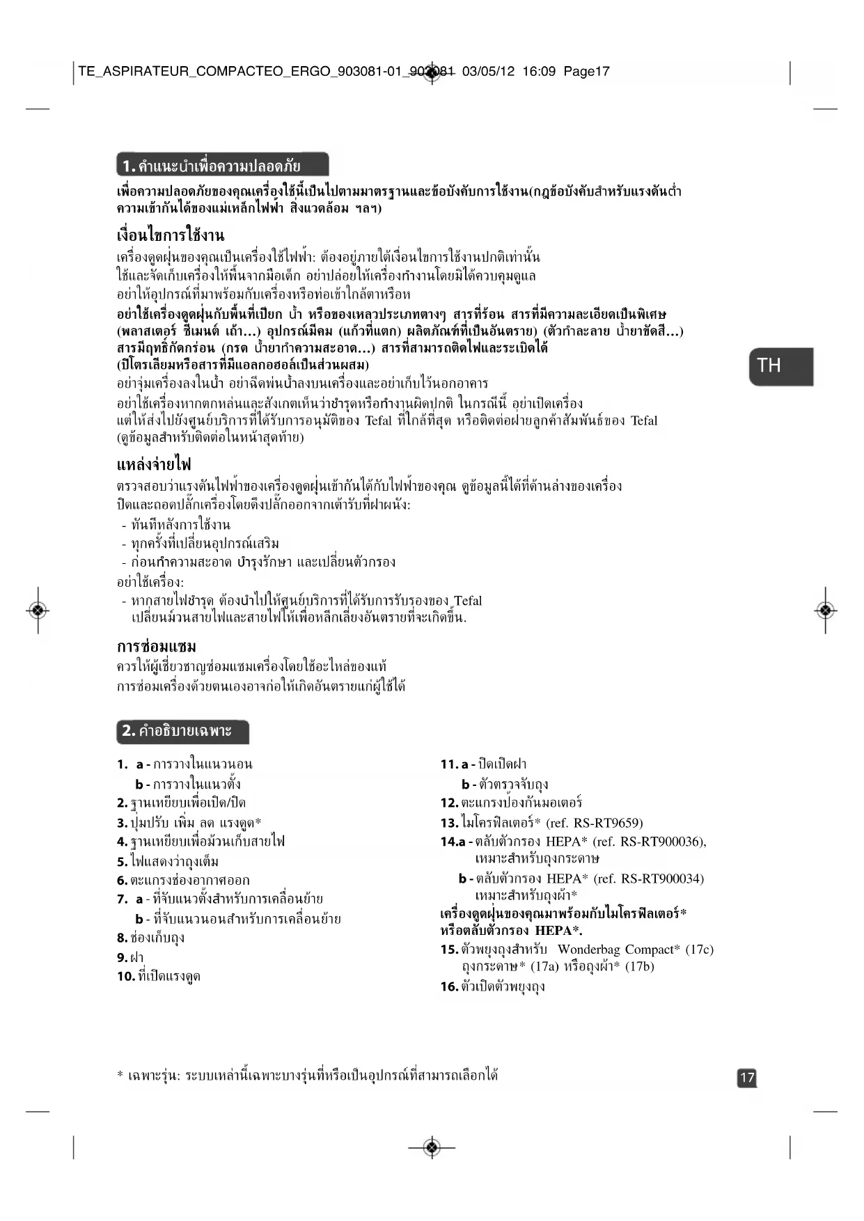 - เฉพาะรุน: ระบบเหลานี้เฉพาะบางรุนที่หรือเป็นอุปกรณที่สามารถเลือกได TE_ASPIRATEUR_COMPACTEO_ERGO_903081-01_903081 03/05/12 16:09 Page2223