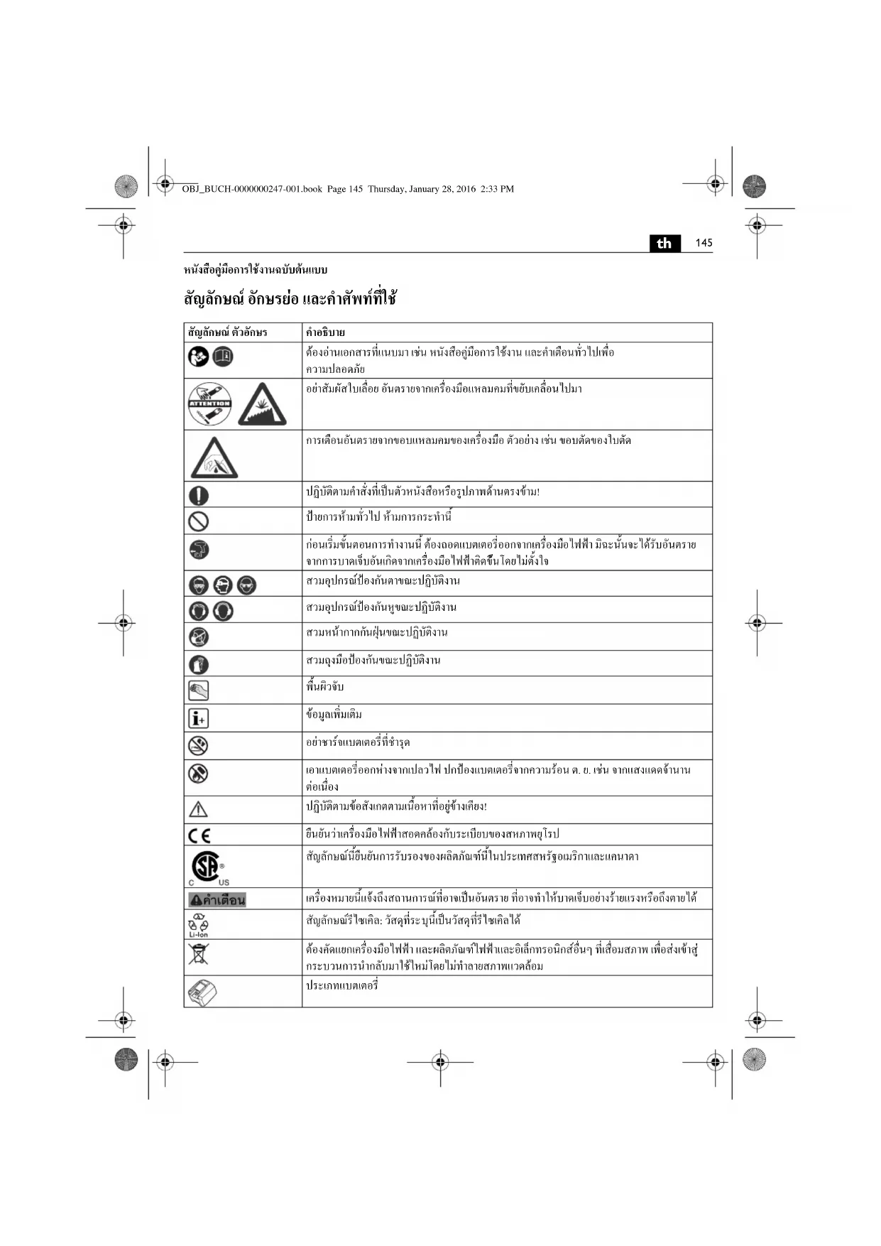 ี้เปนวัสดุท ี่รีไซเคิลได ตองคัดแยกเครื่องมือไฟฟา และผลิตภัณฑไฟฟาและอิเล็กทรอนิกสอื่นๆ ที่เสื่อมสภาพ เพื่อสงเขาสู กระบวนการนํากลับมาใชใหมโดยไมทําลายสภาพแวดล อม ประเภทแบตเตอรี่ OBJ_BUCH-0000000247-001.book Page 145 Thursday, January 28, 2016 2:33 PM146