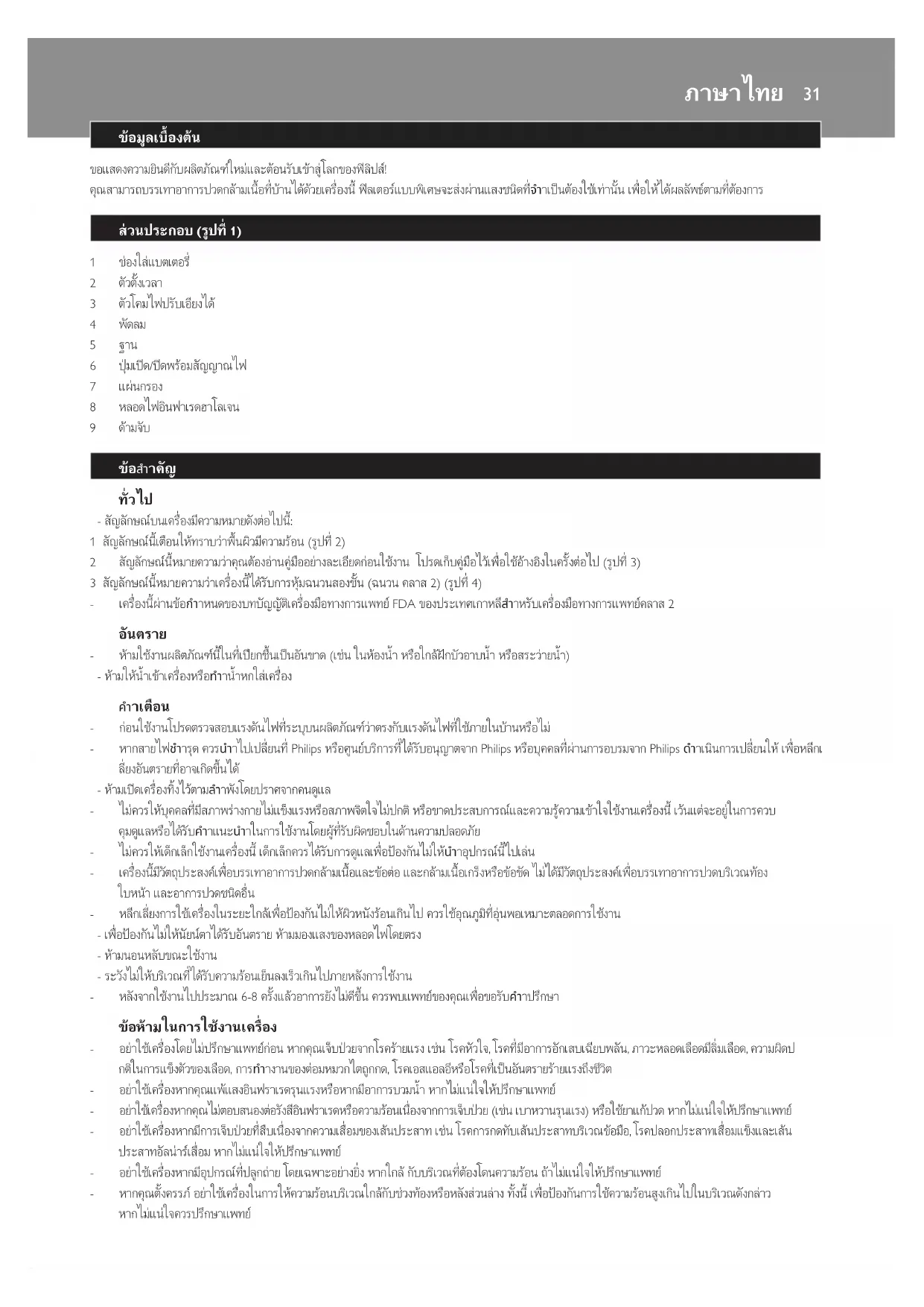 - กอนใชงานโปรดตรวจสอบแรงดันไฟที่ระบุบนผลิตภัณฑวาตรงกับแรงดันไฟที่ใชภายในบานหรือไม - หากสายไฟชำารุด ควรนำาไปเปลี่ยนที่ Philips หรือศูนยบริการที่ไดรับอนุญาตจาก Philips หรือบุคคลที่ผานการอบรมจาก Philips ดำาเนินการเปลี่ยนให เพื่อหลีกเ ลี่ยงอันตรายที่อาจเกิดขึ้นได - หามเปดเครื่องทิ้งไวตามลำาพังโดยปราศจากคนดูแล - ไมควรใหบุคคลที่มีสภาพรางกายไมแข็งแรงหรือสภาพจิตใจไมปกติ หรือขาดประสบการณและความรความเขาใจใชงานเครื่องนี้ เวนแตจะอยในการควบ คุมดูแลหรือไดรับคำาแนะนำาในการใชงานโดยผที่รับผิดชอบในดานความปลอดภัย - ไมควรใหเด็กเล็กใชงานเครื่องนี้ เด็กเล็กควรไดรับการดูแลเพื่อปองกันไมใหนำาอุปกรณนี้ไปเลน - เครื่องนี้มีวัตถุประสงคเพื่อบรรเทาอาการปวดกลามเนื้อและขอตอ และกลามเนื้อเกร็งหรือขอขัด ไมไดมีวัตถุประสงคเพื่อบรรเทาอาการปวดบริเวณทอง ใบหนา และอาการปวดชนิดอื่น - หลีกเลี่ยงการใชเครื่องในระยะใกลเพื่อปองกันไมใหผิวหนังรอนเกินไป ควรใชอุณภูมิที่อนพอเหมาะตลอดการใชงาน - เพื่อปองกันไมใหนัยนตาไดรับอันตราย หามมองแสงของหลอดไฟโดยตรง - หามนอนหลับขณะใชงาน - ระวังไมใหบริเวณที่ไดรับความรอนเย็นลงเร็วเกินไปภายหลังการใชงาน - หลังจากใชงานไปประมาณ 6-8 ครั้งแลวอาการยังไมดีขึ้น ควรพบแพทยของคุณเพื่อขอรับคำาปรึกษา ขอหามในการใชงานเครื่อง - อยาใชเครื่องโดยไมปรึกษาแพทยกอน หากคุณเจ็บปวยจากโรครายแรง เชน โรคหัวใจ, โรคที่มีอาการอักเสบเฉียบพลัน, ภาวะหลอดเลือดมีลิ่มเลือด, ความผิดป กติในการแข็งตัวของเลือด, การทำางานของตอมหมวกไตถูกกด, โรคเอสแอลอีหรือโรคที่เปนอันตรายรายแรงถึงชีวิต - อยาใชเครื่องหากคุณแพแสงอินฟราเรดรุนแรงหรือหากมีอาการบวมน หากไมแนใจใหปรึกษาแพทย - อยาใชเครื่องหากคุณไมตอบสนองตอรังสีอินฟราเรดหรือความรอนเนื่องจากการเจ็บปวย (เชน เบาหวานรุนแรง) หรือใชยาแกปวด หากไมแนใจใหปรึกษาแพทย - อยาใชเครื่องหากมีการเจ็บปวยที่สืบเนื่องจากความเสื่อมของเสนประสาท เชน โรคการกดทับเสนประสาทบริเวณขอมือ, โรคปลอกประสาทเสื่อมแข็งและเสน ประสาทอัลนารเสื่อม หากไมแนใจใหปรึกษาแพทย - อยาใชเครื่องหากมีอุปกรณที่ปลูกถาย โดยเฉพาะอยางยิ่ง หากใกล กับบริเวณที่ตองโดนความรอน ถาไมแนใจใหปรึกษาแพทย - หากคุณตั้งครรภ อยาใชเครื่องในการใหความรอนบริเวณใกลกับชวงทองหรือหลังสวนลาง ทั้งนี้ เพื่อปองกันการใชความรอนสูงเกินไปในบริเวณดังกลาว หากไมแนใจควรปรึกษาแพทย ภาษาไทย- หามใชงานหากคุณมีอาการบวมหรืออักเสบ เนื่องจากความรอนอาจทำาใหอาการรุนแรงยิ่งขึ้น หากมีขอสง