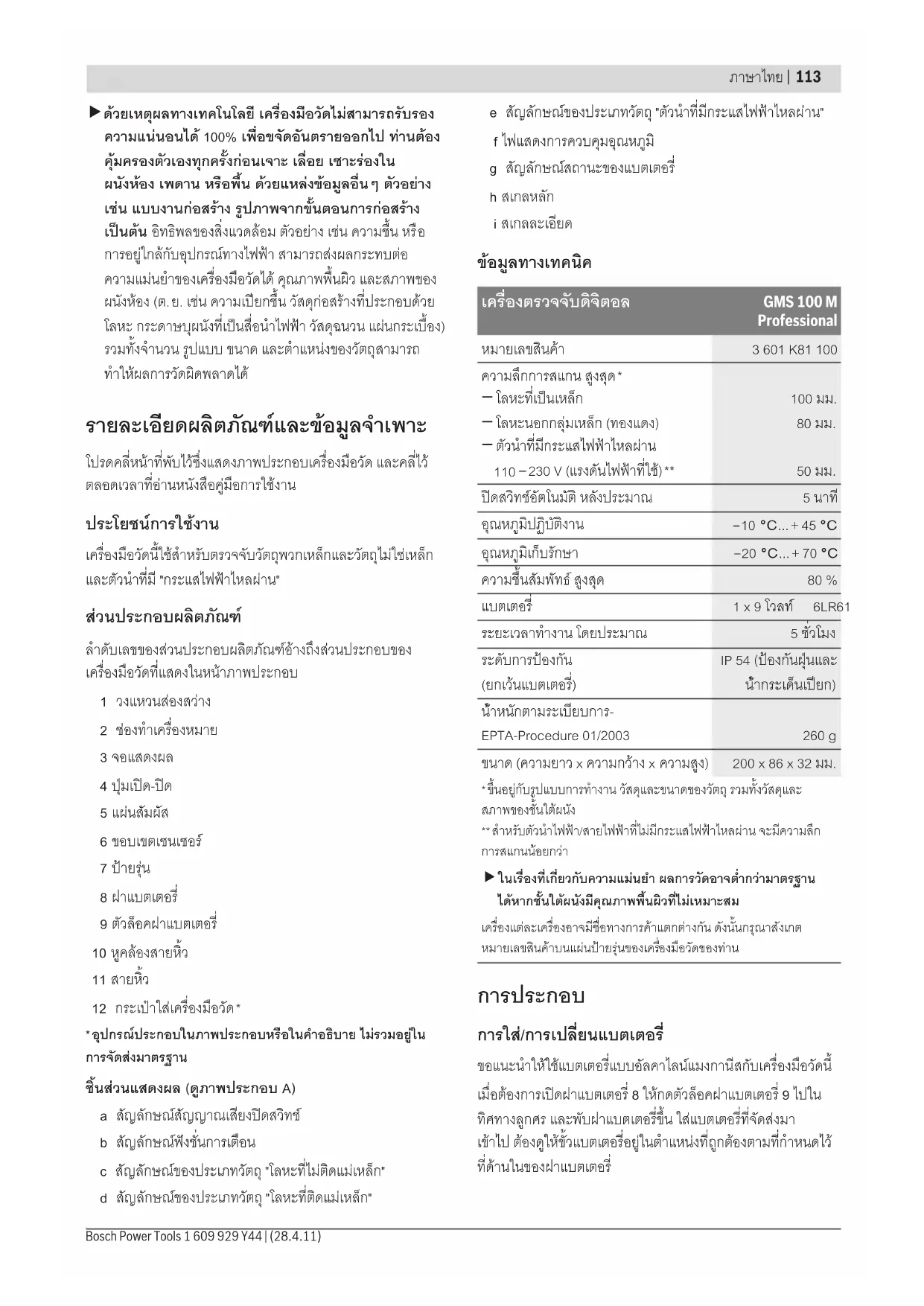 การอยูใกลกับอุปกรณทางไฟฟา สามารถสงผลกระทบตอ ความแมนยําของเครื่องมือวัดได คุณภาพพื้นผิว และสภาพของ ผนังหอง (ต.ย. เชน ความเปยกชื้น วัสดุกอสรางที่ประกอบดวย โลหะ กระดาษบุผนังที่เปนสื่อนําไฟฟา วัสดุฉนวน แผนกระเบื้อง) รวมทั้งจํานวน รูปแบบ ขนาด และตําแหนงของวัตถุสามารถ ทําใหผลการวัดผิดพลาดได รายละเอียดผลิตภัณฑและขอมูลจําเพาะ โปรดคลี่หนาที่พับไวซึ่งแสดงภาพประกอบเครื่องมือวัด และคลี่ไว ตลอดเวลาที่อานหนังสือคูมือการใชงาน ประโยชนการใชงาน เครื่องมือวัดนี้ใชสําหรับตรวจจับวัตถุพวกเหล็กและวัตถุไมใชเหล็ก และตัวนําที่มี "กระแสไฟฟาไหลผาน" สวนประกอบผลิตภัณฑ ลําดับเลขของสวนประกอบผลิตภัณฑอางถึงสวนประกอบของ เครื่องมือวัดที่แสดงในหนาภาพประกอบ 1 วงแหวนสองสวาง 2 ชองทําเครื่องหมาย 3 จอแสดงผล 4 ปุมเปด-ปด 5 แผนสัมผัส 6 ขอบเขตเซนเซอร 7 ปายรุน 8 ฝาแบตเตอรี่ 9 ตัวล็อคฝาแบตเตอรี่ 10 หูคลองสายหิ้ว 11 สายหิ้ว 12 กระเปาใสเครื่องมือวัด* *อุปกรณประกอบในภาพประกอบหรือในคําอธิบาย ไมรวมอยูใน การจัดสงมาตรฐาน ชิ้นสวนแสดงผล (ดูภาพประกอบ A) a สัญลักษณสัญญาณเสียงปดสวิทช b สัญลักษณฟงชั่นการเตือน c สัญลักษณของประเภทวัตถุ "โลหะที่ไมติดแมเหล็ก" d สัญลักษณของประเภทวัตถุ "โลหะที่ติดแมเหล็ก" e สัญลักษณของประเภทวัตถุ "ตัวนําที่มีกระแสไฟฟาไหลผาน" f ไฟแสดงการควบคุมอุณหภูมิ g สัญลักษณสถานะของแบตเตอรี่ h สเกลหลัก i สเกลละเอียด ขอมูลทางเทคนิค