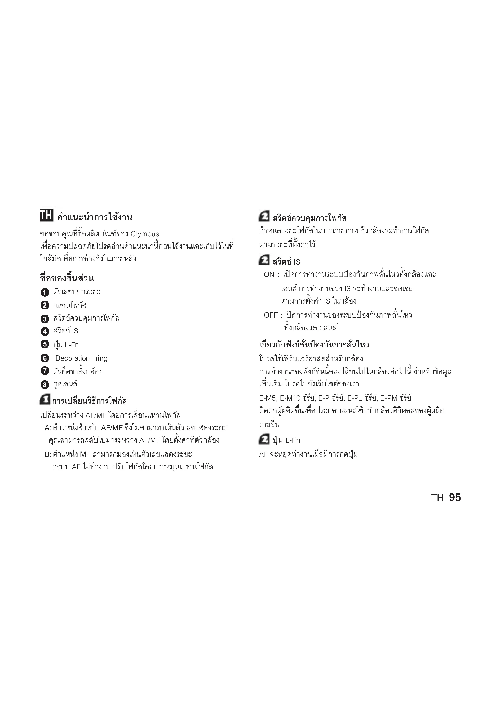 L-Fn ﺭﺯ ﻰﻠﻋ ﻂﻐﻀﻟﺍ ءﺎﻨﺛﺃ ﻞﻤﻌﻟﺍ ﻦﻋ AF ﻲﺋﺎﻘﻠﺘﻟﺍ ﻱﺭﺆﺒﻟﺍ ﺰﻴﻛﺮﺘﻟﺍ ﻒﻗﻮﺘﻳ .ﺭﺰﻟﺍTH 95 คําแนะนําการใชงาน ขอขอบคุณที่ซื้อผลิตภัณฑของ Olympus เพื่อความปลอดภัยโปรดอานคําแนะนํานี้กอนใชงานและเก็บไวในที่ ใกลมือเพื่อการอางอิงในภายหลัง ชื่อของชิ้นสวน