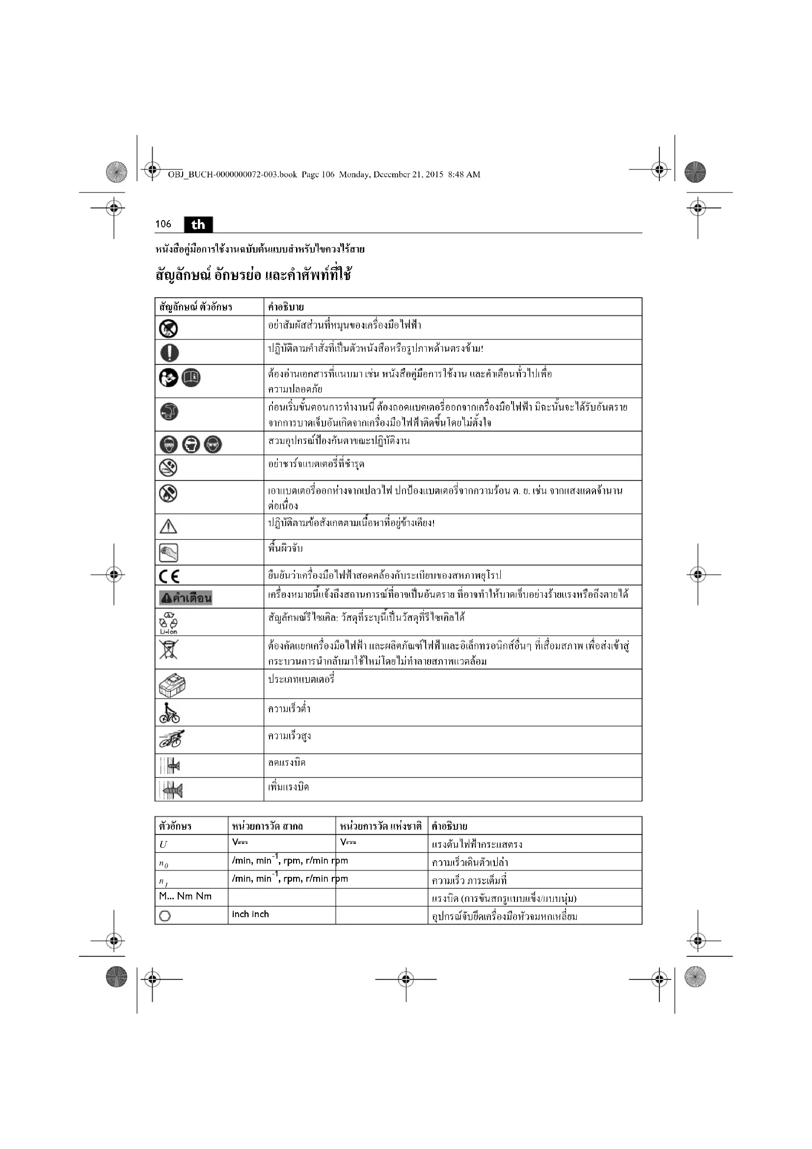 , rpm, r/min rpm ความเร็ว ภาระเต็มที่ M... Nm Nm แรงบิด (การขันสกรูแบบแข็ง/แบบนุม) inch inch อุปกรณจับยึดเครื่องมือหัวจมหกเหลี่ยม OBJ_BUCH-0000000072-003.book Page 106 Monday, December 21, 2015 8:48 AM107