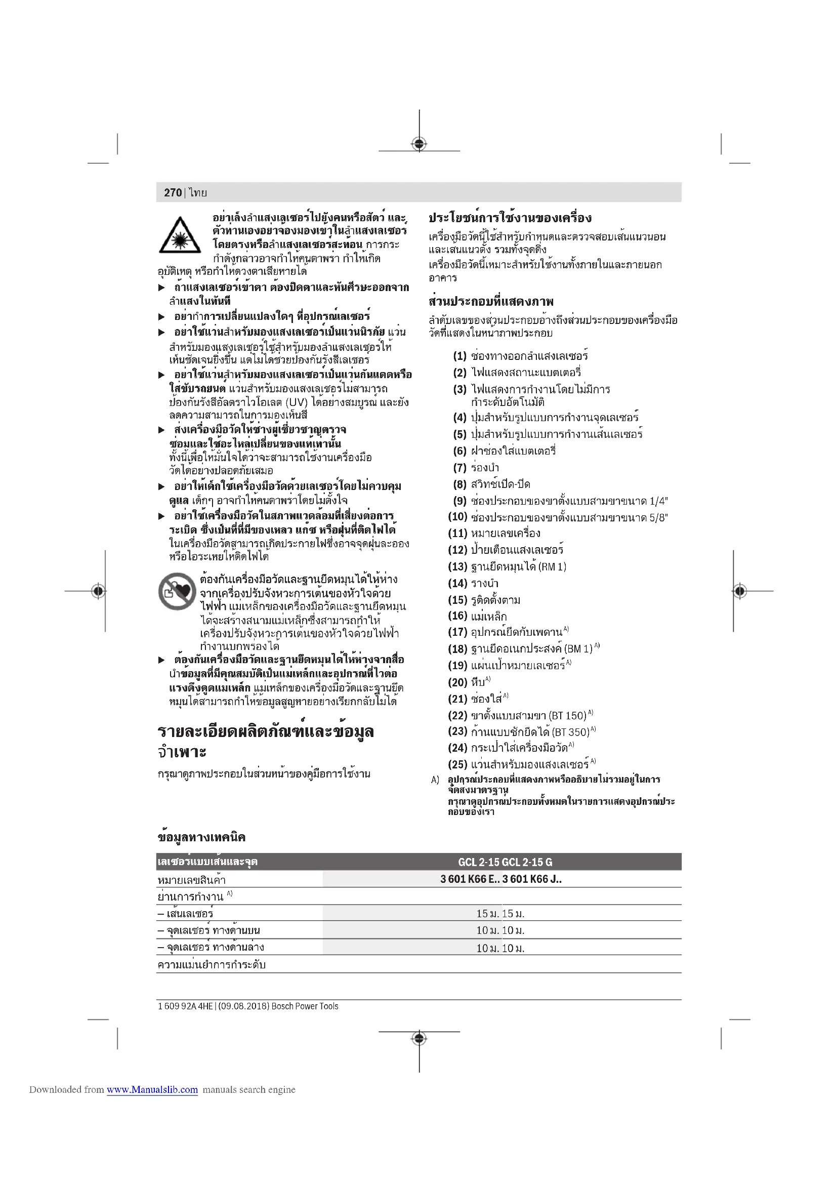กฎระเบียบเพื่อความปลอดภัย ส่งเครื่องมือวัดให้ช่างผู้เชี่ยวชาญตรวจ ซ่อมและใช้อะไหล่เปลี่ยนของแท้เท่านั้น หาก ไม่ใช้เครื่องมือวัดตามคำแนะนำเหล่านี้ ระบบป้องกันเบ็ดเสร็จในเครื่องมือวัดอาจได้ รับผลกระทบ อย่าทำให้ป้ายเตือนที่อยู่บนเครื่องมือวัดนี้ลบ เลือน เก็บรักษาคำแนะนำเหล่านี้ไว้ให้ดี และหากเครื่องมือ วัดนี้ถูกส่งต่อไปยังผู้อื่น ให้ส่งมอบคำแนะนำเหล่านี้ไปด้วย u ข้อควรระวัง - การใช้อุปกรณ์ทำงานหรืออุปกรณ์ปรับ เปลี่ยนอื่นๆ นอกเหนือไปจากที่ระบุไว้ในที่นี้ หรือการใช้ วิธีการอื่นๆ อาจนำไปสู่การสัมผัสกับรังสีอันตรายได้ u เครื่องมือวัดนี้จัดส่งมาพร้อมป้ายเตือน (แสดงในหน้า ภาพประกอบของเครื่องมือวัด) u หากข้อความของป้ายเตือนไม่ได้เป็นภาษาของท่าน ให้ ติดสติกเกอร์ที่จัดส่งมาที่พิมพ์เป็นภาษาของท่านทับลง บนข้อความก่อนใช้งานครั้งแรก ไทย | 269 Bosch Power Tools 1 609 92A 4HE | (09.08.2018) Downloaded from www.Manualslib.com manuals search engine270 | ไทย 1 609 92A 4HE | (09.08.2018) Bosch Power Tools อย่าเล็งลำแสงเลเซอร์ไปยังคนหรือสัตว์ และ ตัวท่านเองอย่าจ้องมองเข้าในลำแสงเลเซอร์ โดยตรงหรือลำแสงเลเซอร์สะท้อน การกระ ทำดังกล่าวอาจทำให้คนตาพร่า ทำให้เกิด อุบัติเหตุ หรือทำให้ดวงตาเสียหายได้ u ถ้าแสงเลเซอร์เข้าตา ต้องปิดตาและหันศีรษะออกจาก ลำแสงในทันที u อย่าทำการเปลี่ยนแปลงใดๆ ที่อุปกรณ์เลเซอร์u อย่าใช้แว่นสำหรับมองแสงเลเซอร์เป็นแว่นนิรภัย แว่น สำหรับมองแสงเลเซอร์ใช้สำหรับมองลำแสงเลเซอร์ให้ เห็นชัดเจนยิ่งขึ้น แต่ไม่ได้ช่วยป้องกันรังสีเลเซอร์ u อย่าใช้แว่นสำหรับมองแสงเลเซอร์เป็นแว่นกันแดดหรือ ใส่ขับรถยนต์ แว่นสำหรับมองแสงเลเซอร์ไม่สามารถ ป้องกันรังสีอัลตราไวโอเลต (UV) ได้อย่างสมบูรณ์ และยัง ลดความสามารถในการมองเห็นสี u ส่งเครื่องมือวัดให้ช่างผู้เชี่ยวชาญตรวจ ซ่อมและใช้อะไหล่เปลี่ยนของแท้เท่านั้น ทั้งนี้เพื่อให้มั่นใจได้ว่าจะสามารถใช้งานเครื่องมือ วัดได้อย่างปลอดภัยเสมอ u อย่าให้เด็กใช้เครื่องมือวัดด้วยเลเซอร์โดยไม่ควบคุม ดูแล เด็กๆ อาจทำให้คนตาพร่าโดยไม่ตั้งใจ u อย่าใช้เครื่องมือวัดในสภาพแวดล้อมที่เสี่ยงต่อการ ระเบิด ซึ่งเป็นที่ที่มีของเหลว แก๊ซ หรือฝุ่นที่ติดไฟได้ ในเครื่องมือวัดสามารถเกิดประกายไฟซึ่งอาจจุดฝุ่นละออง หรือไอระเหยให้ติดไฟได้ ต้องกันเครื่องมือวัดและฐานยึดหมุนได้ให้ห่าง จากเครื่องปรับจังหวะการเต้นของหัวใจด้วย