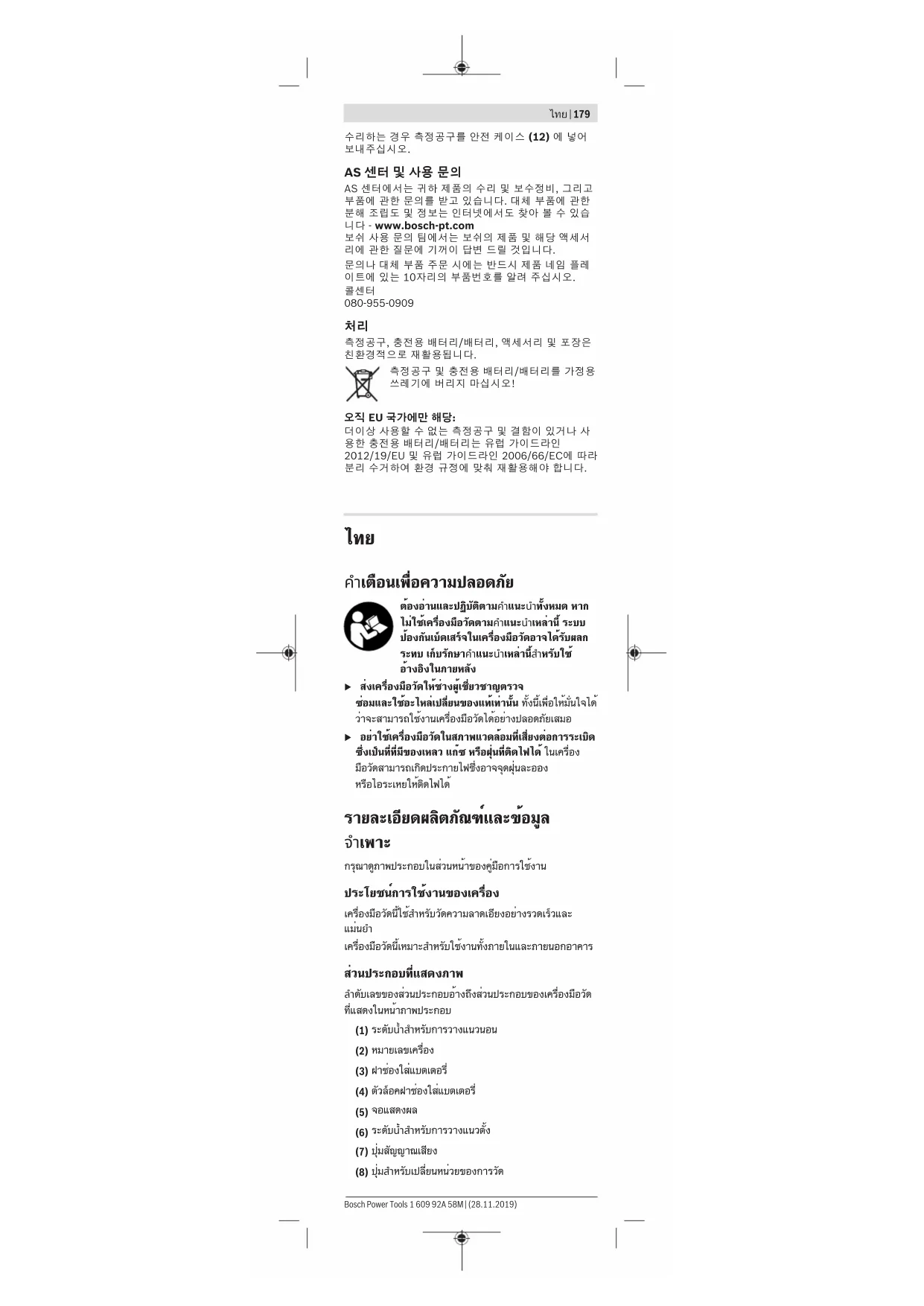 โทรศัพท์ 02 7587555 โทรสาร 02 7587525 1 609 92A 58M | (28.11.2019) Bosch Power ToolsBahasa Indonesia | 185 การกำจัดขยะ เครื่องมือวัด แบตเตอรี่แพ็ค/แบตเตอรี่ อุปกรณ์ประกอบ และ หีบห่อ ต้องนำไปแยกประเภทวัสดุเพื่อนำกลับมาใช้ใหม่โดยไม่ ทำลายสภาพแวดล้อม อย่าทิ้งเครื่องมือวัดและแบตเตอรี่แพ็ค/แบตเตอรี่ลง