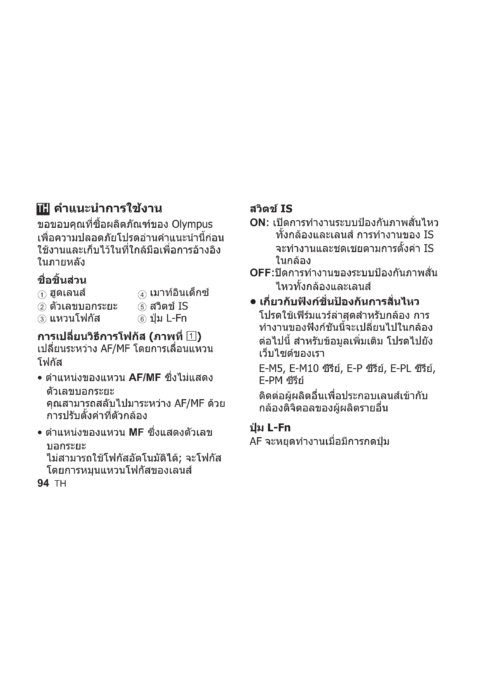 - ระวังอยาหันเลนสไปทางดวงอาทิตย แสงแดดหรือแสงอาทิตยที่สองผานมา บรรจบกันภายในเลนส และผานไปตกที่ โฟกัสภายในกลอง ความรอนที่เกิดขึ้นจะ ทําใหกลองเสียหายและเกิดไฟลลุกใหมได Micro Four Thirds และโลโก Micro Four Thirds เปนเครื่องหมายการคาหรือ เครื่องหมายการคาจดทะเบียนของ OL YMPUS CORPORA TION ѠѨѯєјҙLPDJLQJRWK#RO\PSXVDSFRP ซอฟตแวรในเลนสรุนนี้อาจมีอยูในซอฟตแวร จากผูผลิตรายอื่น ซอฟตแวรจากผูผลิตรายอื่น อาจมีเงื่อนไขและขอตกลงที่กําหนดขึ้น โดย เจาของหรือผูออกใบอนุญาตของซอฟตแวรดัง กลาวที่มีมาให ขอตกลงและประกาศซอฟตแวรจากผูผลิตราย อื่นอาจมีอยูในไฟล PDF ประกาศซอฟตแวรที่ บันทึกอยูที่ http://www.olympus.co.jp/en/support/imsg/ digicamera/download/notice/notice.cfmKR 97