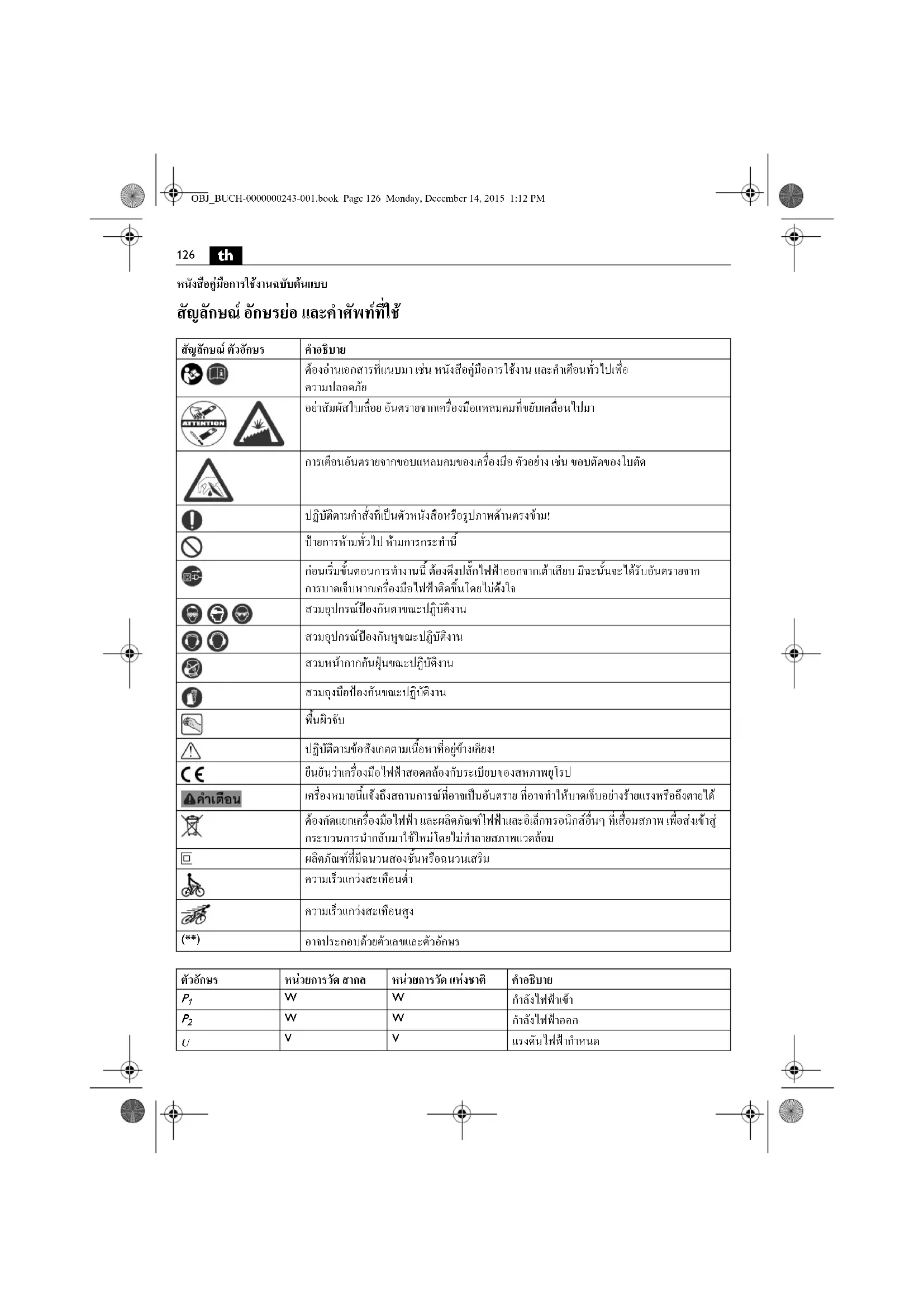 หนังสือคูมือการใชงานฉบับตนแบบ สัญลักษณ อักษรยอ และคําศัพทที่ใช สัญลักษณ ตัวอักษร คําอธิบาย ตองอานเอกสารที่แนบมา เชน หนังสือคูมือการใชงาน และคําเตือนทั่วไปเพื่อ ความปลอดภัย อยาสัมผัสใบเลื่อย อันตรายจากเครื่องมือแหลมคมที่ขยับเคลื่อนไปมา การเตือนอันตรายจากขอบแหลมคมของเครื่องมือ ตัวอยาง เชน ขอบตัดของใบตัด ปฏิบัติตามคําสั่งที่เปนตัวหนังสือหรือรูปภาพดานตรงขาม! ปายการหามทั่วไป ห ามการกระทํานี้ กอนเริ่มขั้นตอนการทํางานนี้ ตองดึงปลั๊กไฟฟาออกจากเตาเสียบ มิฉะนั้นจะไดรับอันตรายจาก การบาดเจ็บหากเครื่องมือไฟฟาติดขึ้นโดยไมตั งใจ สวมอุปกรณปองกันตาขณะปฏิบัติงาน สวมอุปกรณปองกันหูขณะปฏิบัติงาน สวมหนากากกันฝุนขณะปฏิบัติงาน สวมถุงมือปองกันขณะปฏิบัติงาน