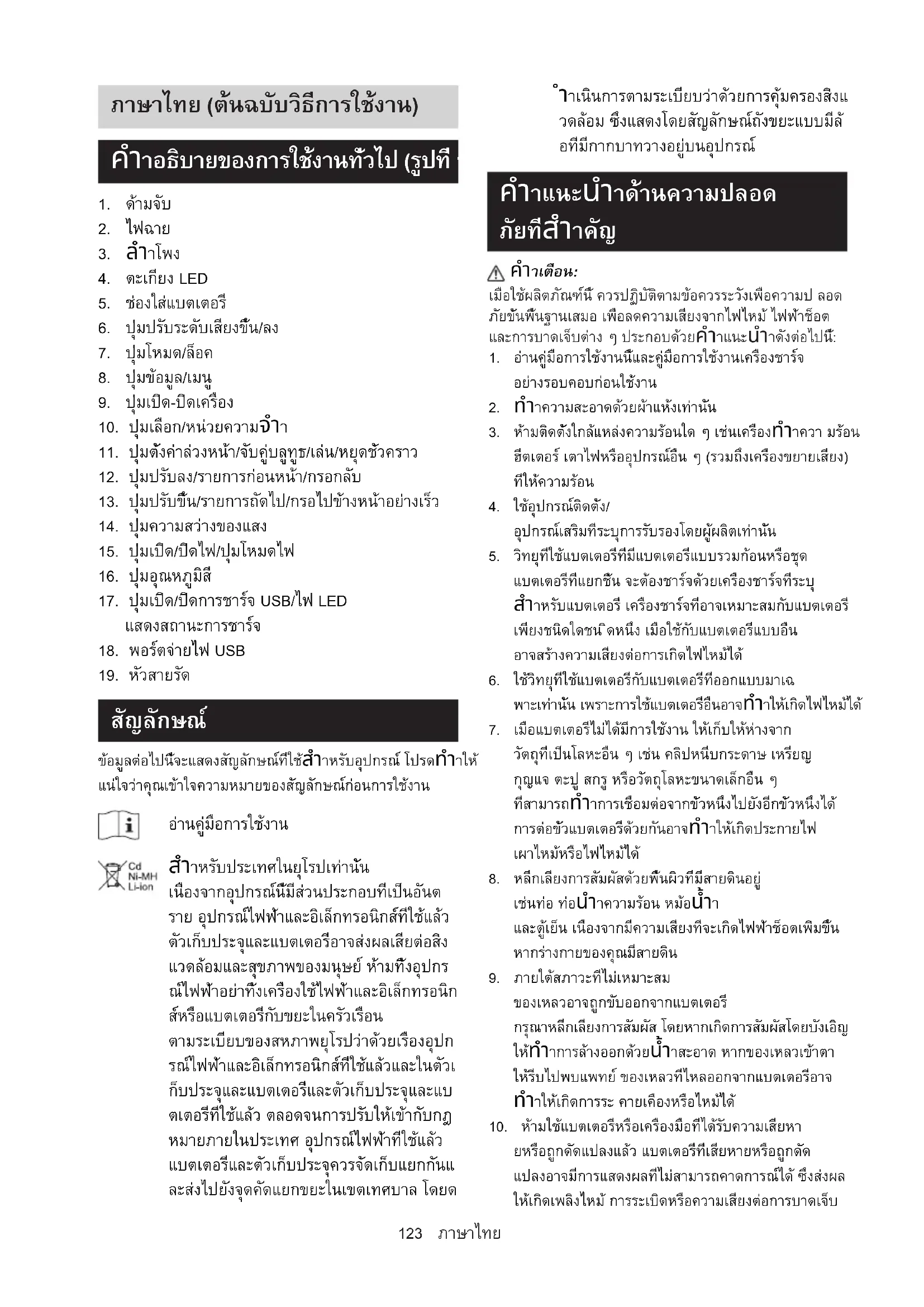 ข้อมูลต่อไปนี้จะแสดงสัญลักษณ์ที่ใช้สำาหรับอุปกรณ์ โปรดทำาให้ แน่ใจว่าคุณเข้าใจความหมายของสัญลักษณ์ก่อนการใช้งาน อ่านคู่มือการใช้งาน สำาหรับประเทศในยุโรปเท่านั้น เนื่องจากอุปกรณ์นี้มีส่วนประกอบที่เป็นอันต ราย อุปกรณ์ไฟฟ้าและอิเล็กทรอนิกส์ที่ใช้แล้ว ตัวเก็บประจุและแบตเตอรี่อาจส่งผลเสียต่อสิ่ง แวดล้อมและสุขภาพของมนุษย์ ห้ามทิ้งอุปกร ณ์ไฟฟ้าอย่าทิ้งเครื่องใช้ไฟฟ้าและอิเล็กทรอนิก ส์หรือแบตเตอรี่กับขยะในครัวเรือน ตามระเบียบของสหภาพยุโรปว่าด้วยเรื่องอุปก รณ์ไฟฟ้าและอิเล็กทรอนิกส์ที่ใช้แล้วและในตัวเ ก็บประจุและแบตเตอรี่และตัวเก็บประจุและแบ ตเตอรี่ที่ใช้แล้ว ตลอดจนการปรับให้เข้ากับกฎ หมายภายในประเทศ อุปกรณ์ไฟฟ้าที่ใช้แล้ว แบตเตอรี่และตัวเก็บประจุควรจัดเก็บแยกกันแ ละส่งไปยังจุดคัดแยกขยะในเขตเทศบาล โดยด ำาเนินการตามระเบียบว่าด้วยการคุ้มครองสิ่งแ วดล้อม ซึ่งแสดงโดยสัญลักษณ์ถังขยะแบบมีล้ อที่มีกากบาทวางอยู่บนอุปกรณ์ คำาแนะนำาด้านความปลอด ภัยที่สำาคัญ