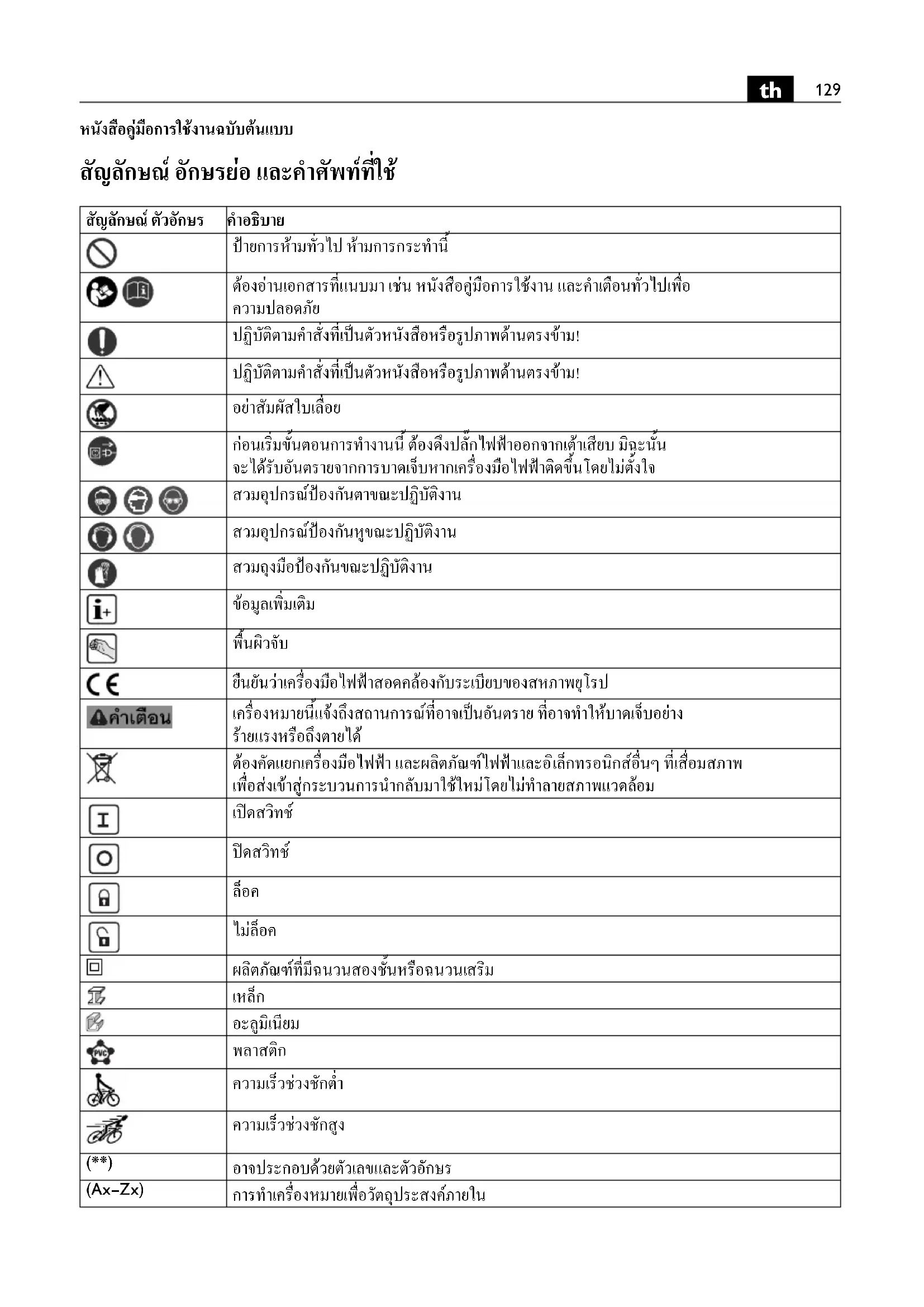 หนังสือคูมือการใชงานฉบับตนแบบ สัญลักษณ อักษรยอ และคําศัพทที่ใช สัญลักษณ ตัวอักษร คําอธิบาย ปายการหามทั่วไป หามการกระทํานี้ ตองอานเอกสารที่แนบมา เชน หนังสือคูมือการใชงาน และคําเตือนทั่วไปเพื่อ ความปลอดภัย ปฏิบัติตามคําสั่งที่เปนตัวหนังสือหรือรูปภาพดานตรงขาม! ปฏิบัติตามคําสั่งที่เปนตัวหนังสือหรือรูปภาพดานตรงขาม! อยาสัมผัสใบเลื่อย กอนเริ่มขั้นตอนการทํางานนี้ ตองดึงปลั๊กไฟฟาออกจากเตาเสียบ มิฉะนั้น จะไดรับอันตรายจากการบาดเจ็บหากเครื่องมือไฟฟาติดขึ้นโดยไมตั้งใจ สวมอุปกรณปองกันตาขณะปฏิบัติงาน สวมอุปกรณปองกันหูขณะปฏิบัติงาน สวมถุงมือปองกันขณะปฏิบัติงาน ขอมูลเพิ่มเติม