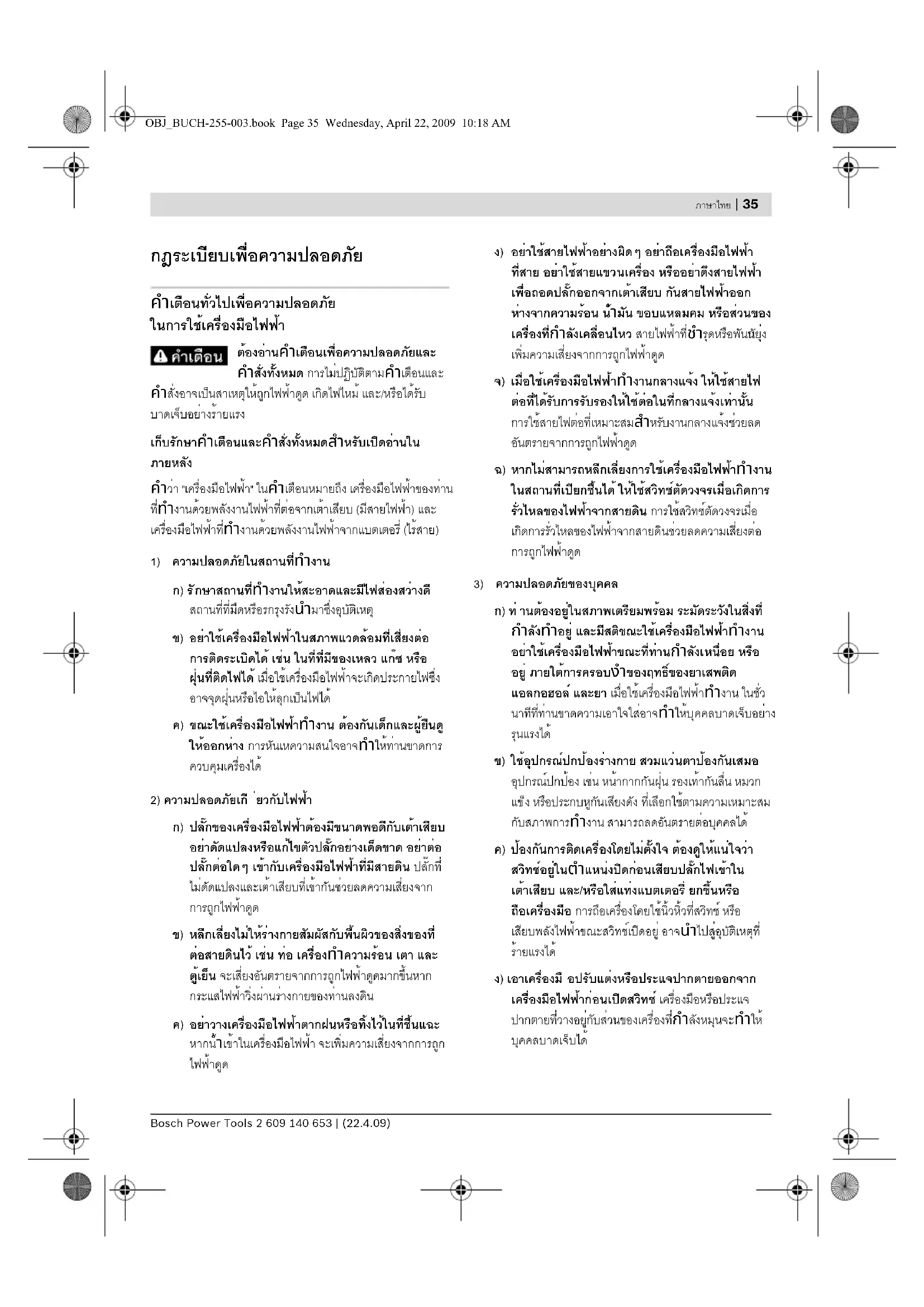 ง) เอาเครื่องมื อปรับแต่งหรือประแจปากตายออกจาก เครื่องมือไฟฟ้าก่อนเปิดสวิทช์ เครื่องมือหรือประแจ ปากตายที่วางอยู่กับส่วนของเครื่องที่กำลังหมุนจะทำให้ บุคคลบาดเจ็บได้ OBJ_BUCH-255-003.book Page 35 Wednesday, April 22, 2009 10:18 AM36 | ภาษาไทย 2 609 140 653 | (22.4.09) Bosch Power Tools จ) หลีกเลี่ยงการตั้งท่าที่ผิดปกติ ตั้งท่ายืนที่มั่นคงและ วางน้ำหนักให้สมดุลตลอดเวลา ในลักษณะนี้ท่าน สามารถควบคุมเครื่องมือไฟฟ้าในสถานการณ์ที่ไม่คาดคิด