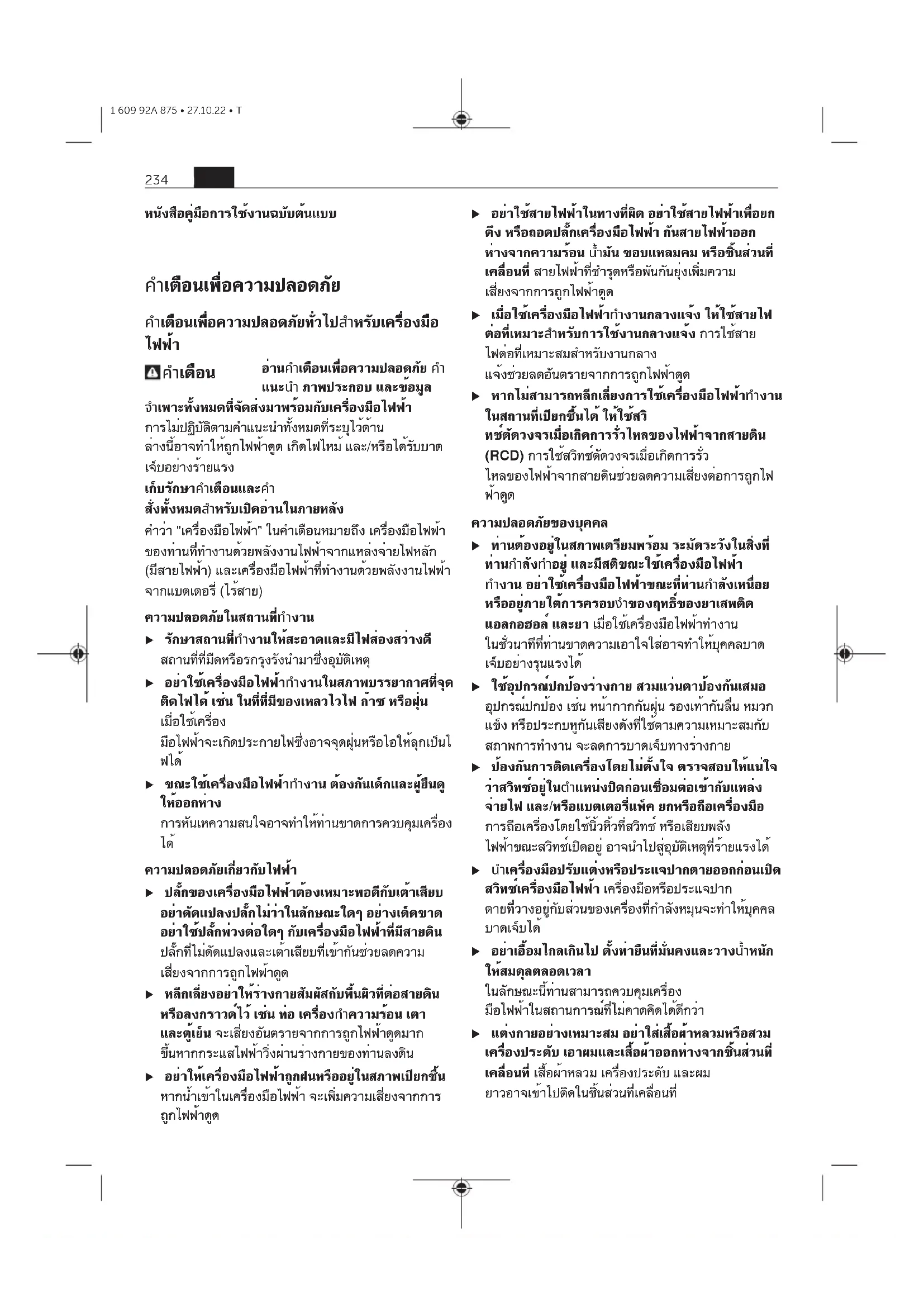 ความปลอดภัยเกี่ยวกับไฟฟ้าไทย u ปลั๊กของเครื่องมือไฟฟ้าต้องเหมาะพอดีกับเต้าเสียบ อย่าดัดแปลงปลั๊กไม่ว่าในลักษณะใดๆ อย่างเด็ดขาด อย่าใช้ปลั๊กพ่วงต่อใดๆ กับเครื่องมือไฟฟ้าที่มีสายดิน ปลั๊กที่ไม่ดัดแปลงและเต้าเสียบที่เข้ากันช่วยลดความ เสี่ยงจากการถูกไฟฟ้าดูด u หลีกเลี่ยงอย่าให้ร่างกายสัมผัสกับพื้นผิวที่ต่อสายดิน หรือลงกราวด์ไว้ เช่น ท่อ เครื่องทำความร้อน เตา และตู้เย็น จะเสี่ยงอันตรายจากการถูกไฟฟ้าดูดมาก ขึ้นหากกระแสไฟฟ้าวิ่งผ่านร่างกายของท่านลงดิน u อย่าให้เครื่องมือไฟฟ้าถูกฝนหรืออยู่ในสภาพเปียกชื้น หากน้ำเข้าในเครื่องมือไฟฟ้า จะเพิ่มความเสี่ยงจากการ ถูกไฟฟ้าดูด u อย่าใช้สายไฟฟ้าในทางที่ผิด อย่าใช้สายไฟฟ้าเพื่อยก ดึง หรือถอดปลั๊กเครื่องมือไฟฟ้า กันสายไฟฟ้าออก ห่างจากความร้อน น้ำมัน ขอบแหลมคม หรือชิ้นส่วนที่ เคลื่อนที่ สายไฟฟ้าที่ชำรุดหรือพันกันยุ่งเพิ่มความ เสี่ยงจากการถูกไฟฟ้าดูด u เมื่อใช้เครื่องมือไฟฟ้าทำงานกลางแจ้ง ให้ใช้สายไฟ ต่อที่เหมาะสำหรับการใช้งานกลางแจ้ง การใช้สาย ไฟต่อที่เหมาะสมสำหรับงานกลาง แจ้งช่วยลดอันตรายจากการถูกไฟฟ้าดูด u หากไม่สามารถหลีกเลี่ยงการใช้เครื่องมือไฟฟ้าทำงาน ในสถานที่เปียกชื้นได้ ให้ใช้สวิ ทช์ตัดวงจรเมื่อเกิดการรั่วไหลของไฟฟ้าจากสายดิน (RCD) การใช้สวิทช์ตัดวงจรเมื่อเกิดการรั่ว ไหลของไฟฟ้าจากสายดินช่วยลดความเสี่ยงต่อการถูกไฟ