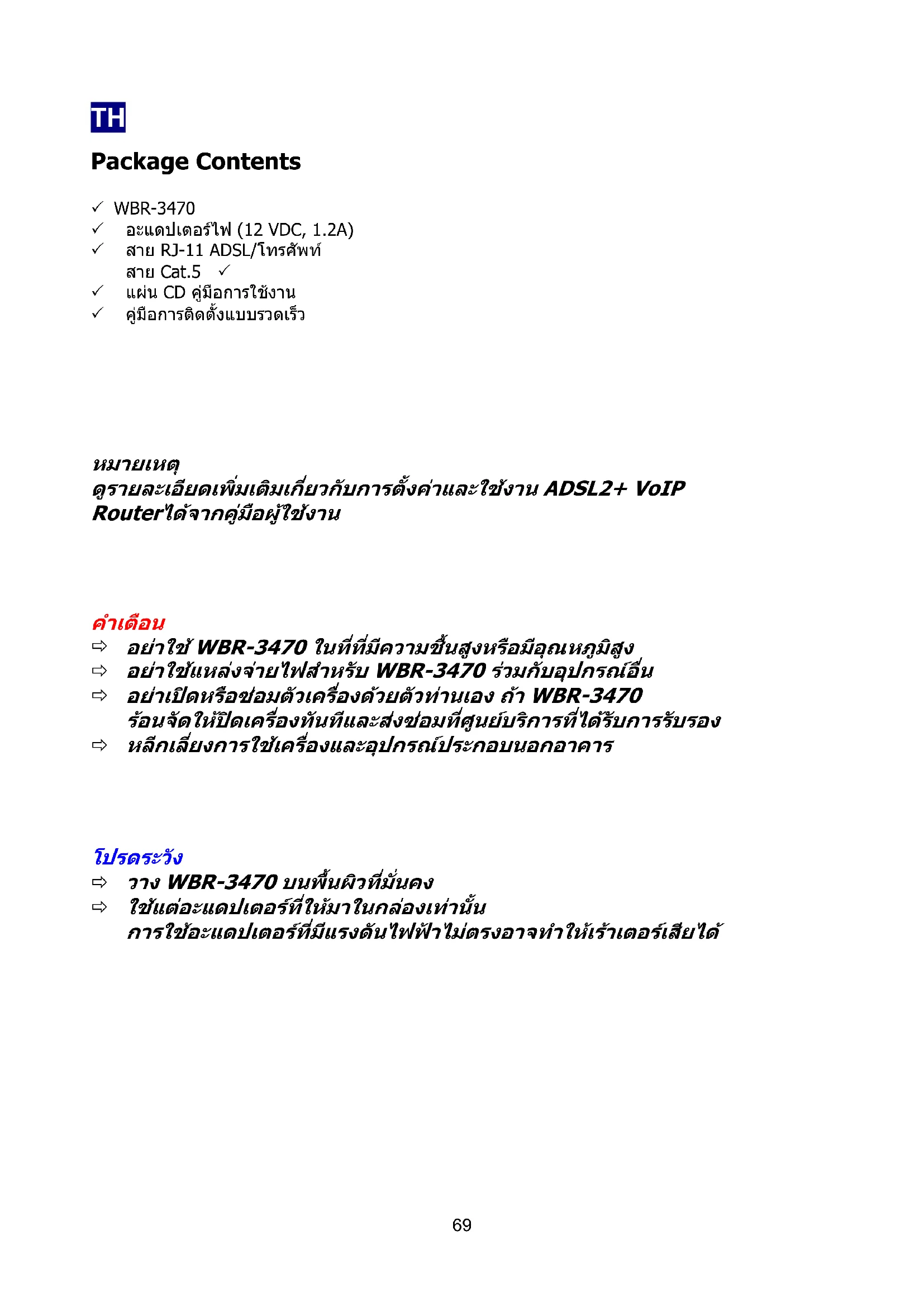 68TH Package Contents 3 WBR-3470 อะแดปเตอรไฟ (12 VDC, 1.2A) 3 สาย RJ-11 ADSL/โทรศัพท 3 สาย Cat.5 3 แผน CD คูมือการใชงาน 3 คูมือการติดตั้งแบบรวดเร็ว 3