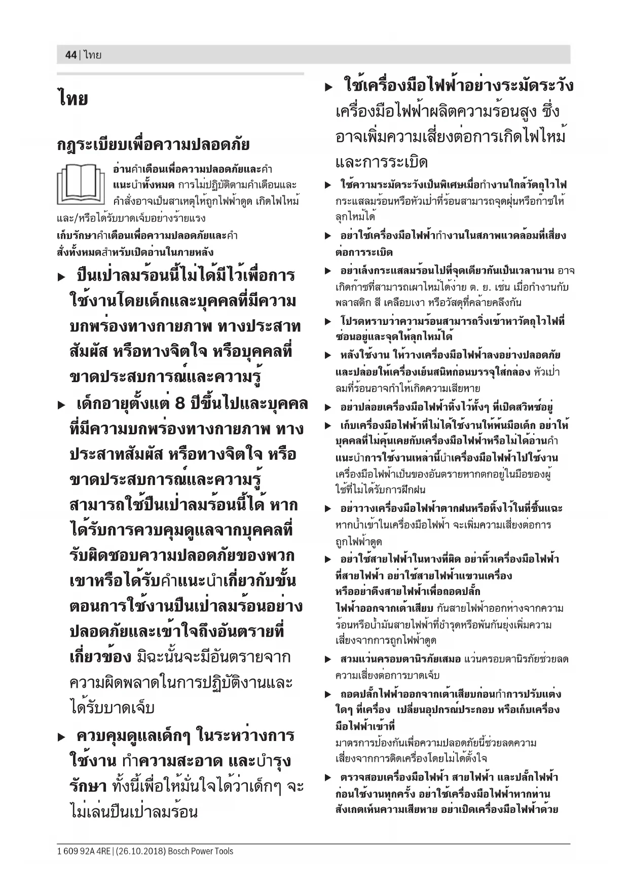 กฎระเบียบเพื่อความปลอดภัย อ่านคำเตือนเพื่อความปลอดภัยและคำ แนะนำทั้งหมด การไม่ปฏิบัติตามคำเตือนและ คำสั่งอาจเป็นสาเหตุให้ถูกไฟฟ้าดูด เกิดไฟไหม้ และ/หรือได้รับบาดเจ็บอย่างร้ายแรง เก็บรักษาคำเตือนเพื่อความปลอดภัยและคำ สั่งทั้งหมดสำหรับเปิดอ่านในภายหลัง u ปืนเป่าลมร้อนนี้ไม่ได้มีไว้เพื่อการ ใช้งานโดยเด็กและบุคคลที่มีความ บกพร่องทางกายภาพ ทางประสาท สัมผัส หรือทางจิตใจ หรือบุคคลที่ ขาดประสบการณ์และความรู้ u เด็กอายุตั้งแต่ 8 ปีขึ้นไปและบุคคล ที่มีความบกพร่องทางกายภาพ ทาง ประสาทสัมผัส หรือทางจิตใจ หรือ ขาดประสบการณ์และความรู้ สามารถใช้ปืนเป่าลมร้อนนี้ได้ หาก ได้รับการควบคุมดูแลจากบุคคลที่ รับผิดชอบความปลอดภัยของพวก เขาหรือได้รับคำแนะนำเกี่ยวกับขั้น ตอนการใช้งานปืนเป่าลมร้อนอย่าง ปลอดภัยและเข้าใจถึงอันตรายที่ เกี่ยวข้อง มิฉะนั้นจะมีอันตรายจาก ความผิดพลาดในการปฏิบัติงานและ ได้รับบาดเจ็บ u ควบคุมดูแลเด็กๆ ในระหว่างการ ใช้งาน ทำความสะอาด และบำรุง รักษา ทั้งนี้เพื่อให้มั่นใจได้ว่าเด็กๆ จะ ไม่เล่นปืนเป่าลมร้อน u ใช้เครื่องมือไฟฟ้าอย่างระมัดระวัง เครื่องมือไฟฟ้าผลิตความร้อนสูง ซึ่ง อาจเพิ่มความเสี่ยงต่อการเกิดไฟไหม้ และการระเบิด u ใช้ความระมัดระวังเป็นพิเศษเมื่อทำงานใกล้วัตถุไวไฟ กระแสลมร้อนหรือหัวเป่าที่ร้อนสามารถจุดฝุ่นหรือก๊าซให้