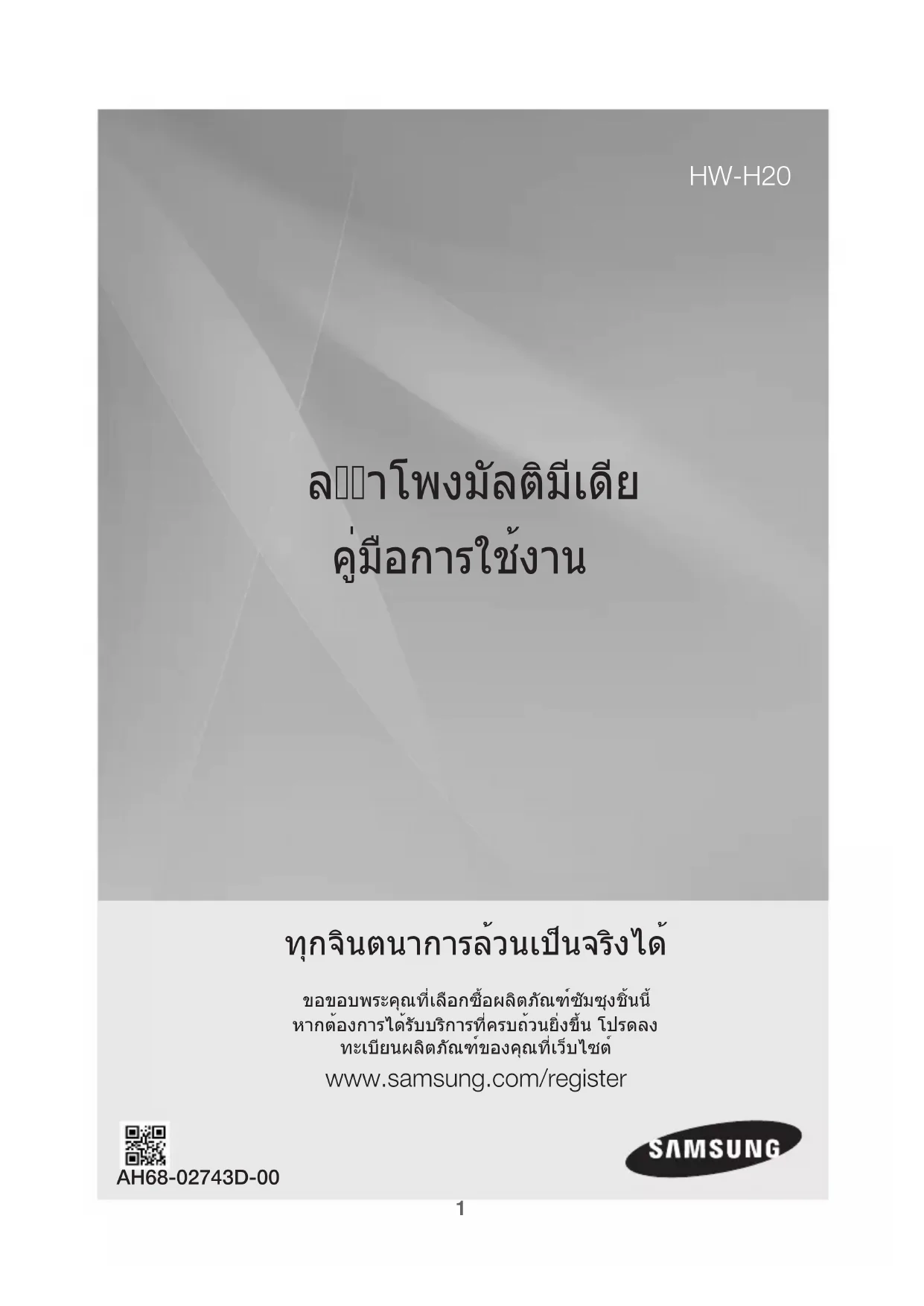 ลำโพงมัลติมีเดีย คู่มือกรใช้งน ทุกจินตนกรล้วนเป็นจริงได้ ขอขอบพระคุณที่เลือกซื้อผลิตภัณฑ์ซัมซุงชิ้นนี้หกต้องกรได้รับบริกรที่ครบถ้วนยิ่งขึ้น โปรดลงทะเบียนผลิตภัณฑ์ของคุณที่เว็บไซต์ www.samsung.com/register HW-H20