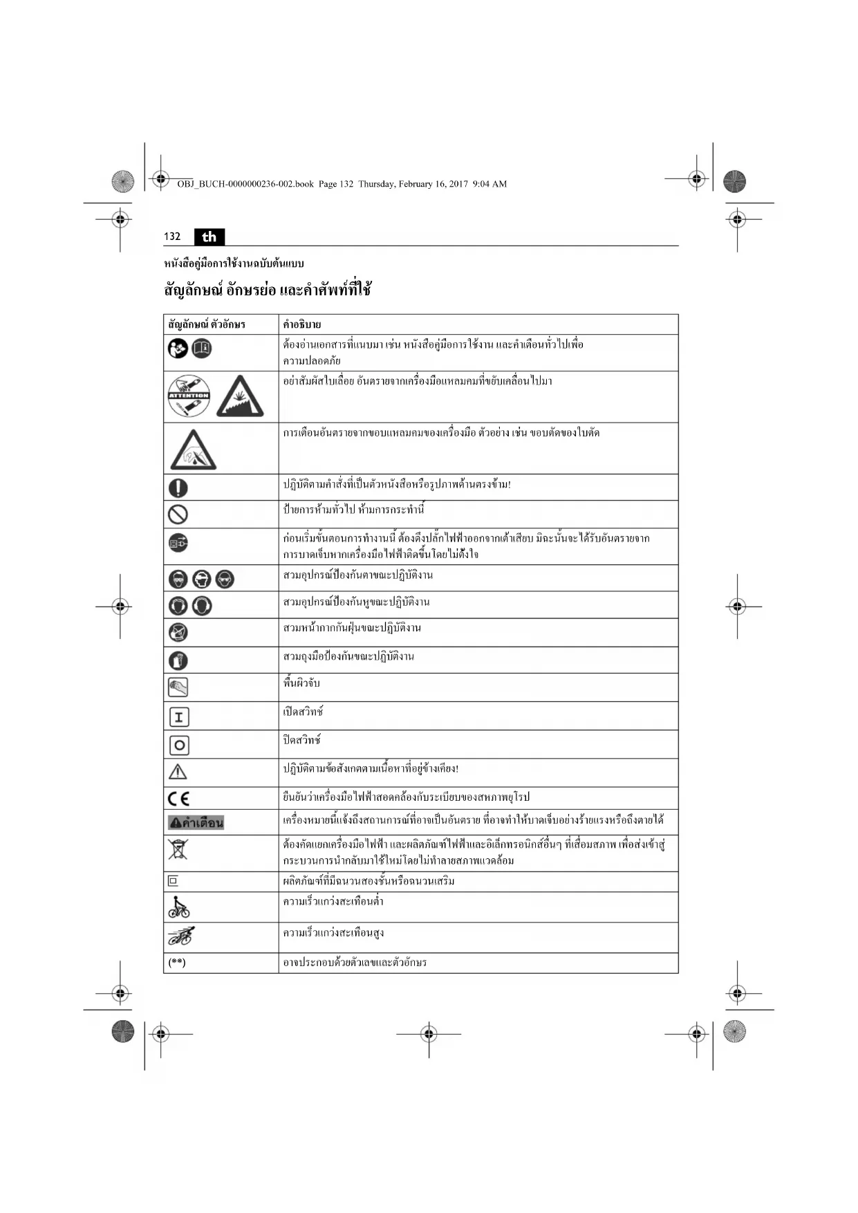 ปฏิบัติตามข อสังเกตตามเนื้อหาที่อยูขางเคียง! ยืนยันวาเครื่องมือไฟฟาสอดคลองกับระเบียบของสหภาพยุโรป เครื่องหมายนี้แจงถึงสถานการณที่อาจเปนอันตราย ที่อาจทําใหบาดเจ็บอยางรายแรงหรือถึงตายได ตองคัดแยกเครื่องมือไฟฟา และผลิตภัณฑไฟฟาและอิเล็กทรอนิกสอื่นๆ ที่เสื่อมสภาพ เพื่อสงเขาสู กระบวนการนํากลับมาใชใหมโดยไมทําลายสภาพแวดล อม ผลิตภัณฑที่มีฉนวนสองชั้นหรือฉนวนเสริม ความเร็วแกว งสะเทือนต่ํา ความเร็วแกวงสะเทือนสูง (**) อาจประกอบดวยตัวเลขและตัวอักษร OBJ_BUCH-0000000236-002.book Page 132 Thursday, February 16, 2017 9:04 AM133
