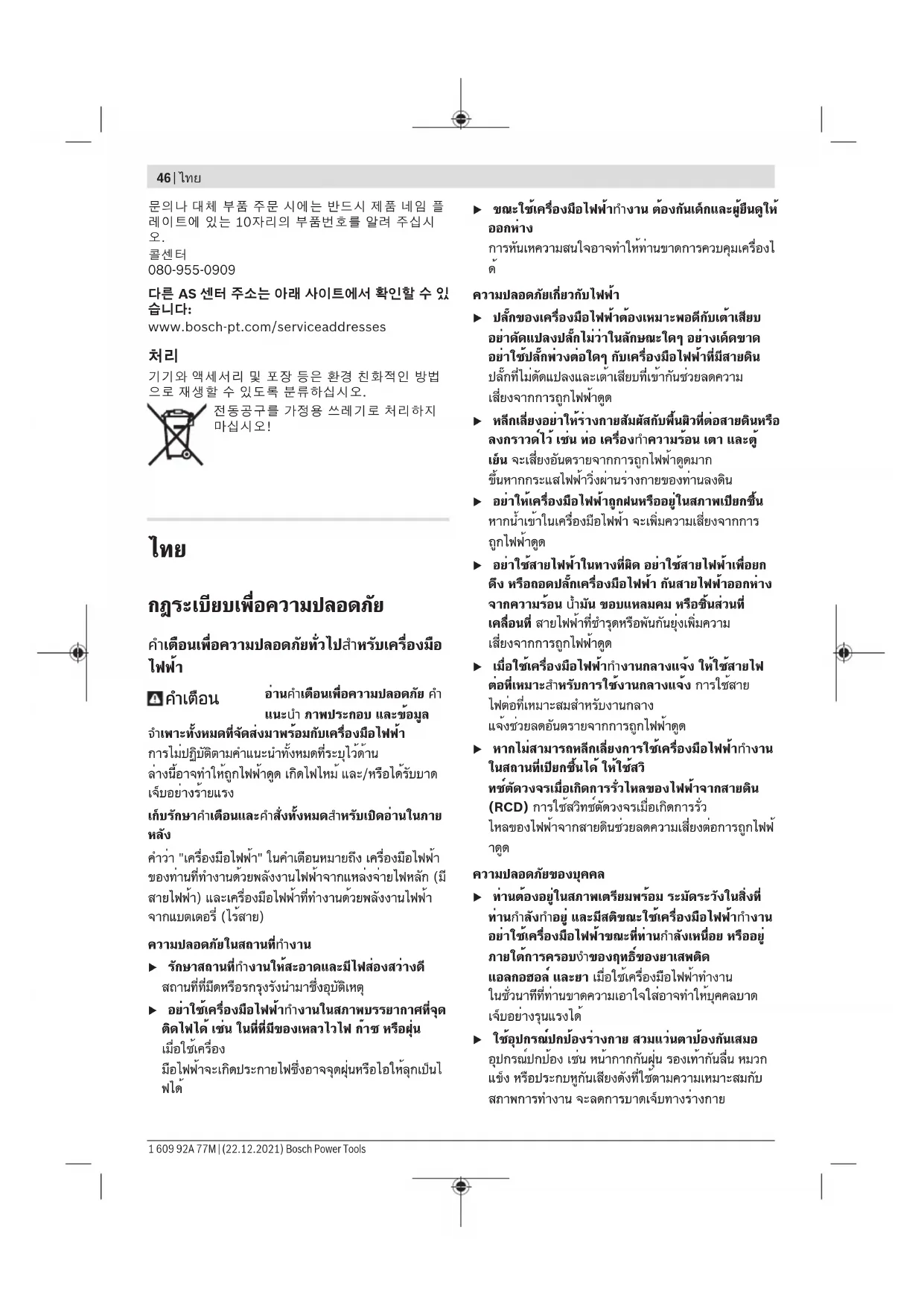 ไทย บริษัท โรเบิร์ต บ๊อช จำกัด เอฟวายไอ เซ็นเตอร์ อาคาร 1 ชั้น 5 เลขที่ 2525 ถนนพระราม 4 แขวงคลองเตย เขตคลองเตย กรุงเทพฯ 10110 โทร: +66 2012 8888 แฟกซ์: +66 2064 5800 www.bosch.co.th ศูนย์บริการซ่อมและฝึกอบรม บ๊อช อาคาร ลาซาลทาวเวอร์ ชั้น G ห้องเลขที่ 2 บ้านเลขที่ 10/11 หมู่ 16 ถนนศรีนครินทร์ ตำบลบางแก้ว อำเภอบางพลี จังหวัดสมุทรปราการ 10540