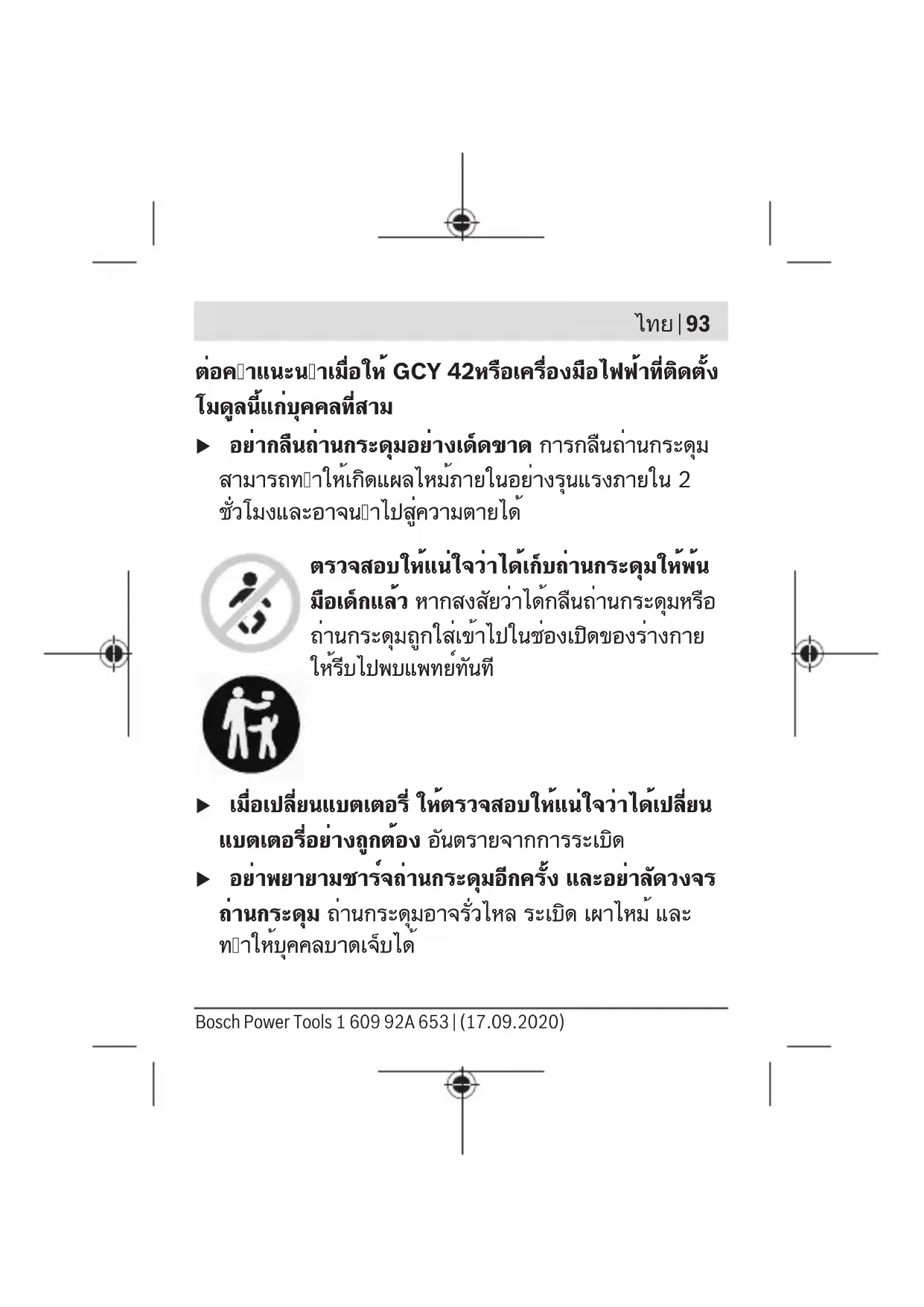 กฎระเบียบเพื่อความปลอดภัย ต้องอ่านและปฏิบัติตามคำแนะนำทั้งหมดเพื่อ ให้สามารถทำงานกับGCY42 ได้อย่าง ปลอดภัย เก็บคำแนะนำเหล่านี้ไว้ให้ดี และส่ง 1 609 92A 653 | (17.09.2020) Bosch Power Toolsไทย | 93 ต่อคำแนะนำเมื่อให้ GCY42หรือเครื่องมือไฟฟ้าที่ติดตั้ง โมดูลนี้แก่บุคคลที่สาม u อย่ากลืนถ่านกระดุมอย่างเด็ดขาด การกลืนถ่านกระดุม สามารถทำให้เกิดแผลไหม้ภายในอย่างรุนแรงภายใน 2 ชั่วโมงและอาจนำไปสู่ความตายได้ ตรวจสอบให้แน่ใจว่าได้เก็บถ่านกระดุมให้พ้น มือเด็กแล้ว หากสงสัยว่าได้กลืนถ่านกระดุมหรือ ถ่านกระดุมถูกใส่เข้าไปในช่องเปิดของร่างกาย ให้รีบไปพบแพทย์ทันที u เมื่อเปลี่ยนแบตเตอรี่ ให้ตรวจสอบให้แน่ใจว่าได้เปลี่ยน แบตเตอรี่อย่างถูกต้อง อันตรายจากการระเบิด u อย่าพยายามชาร์จถ่านกระดุมอีกครั้ง และอย่าลัดวงจร ถ่านกระดุม ถ่านกระดุมอาจรั่วไหล ระเบิด เผาไหม้ และ ทำให้บุคคลบาดเจ็บได้ Bosch Power Tools 1 609 92A 653 | (17.09.2020)94 | ไทย u นำถ่านกระดุมที่หมดไฟแล้วออกมา และนำไปกำจัดอย่าง ถูกต้อง ถ่านกระดุมที่หมดไฟแล้วอาจรั่วไหล และส่งผลเสีย หายต่อผลิตภัณฑ์หรือทำให้บุคคลบาดเจ็บได้ u อย่าให้ถ่านกระดุมร้อนมากเกินไป และอย่าโยนเข้ากอง ไฟ ถ่านกระดุมอาจรั่ว ระเบิด ไหม้ และทำให้บุคคลบาดเจ็บ