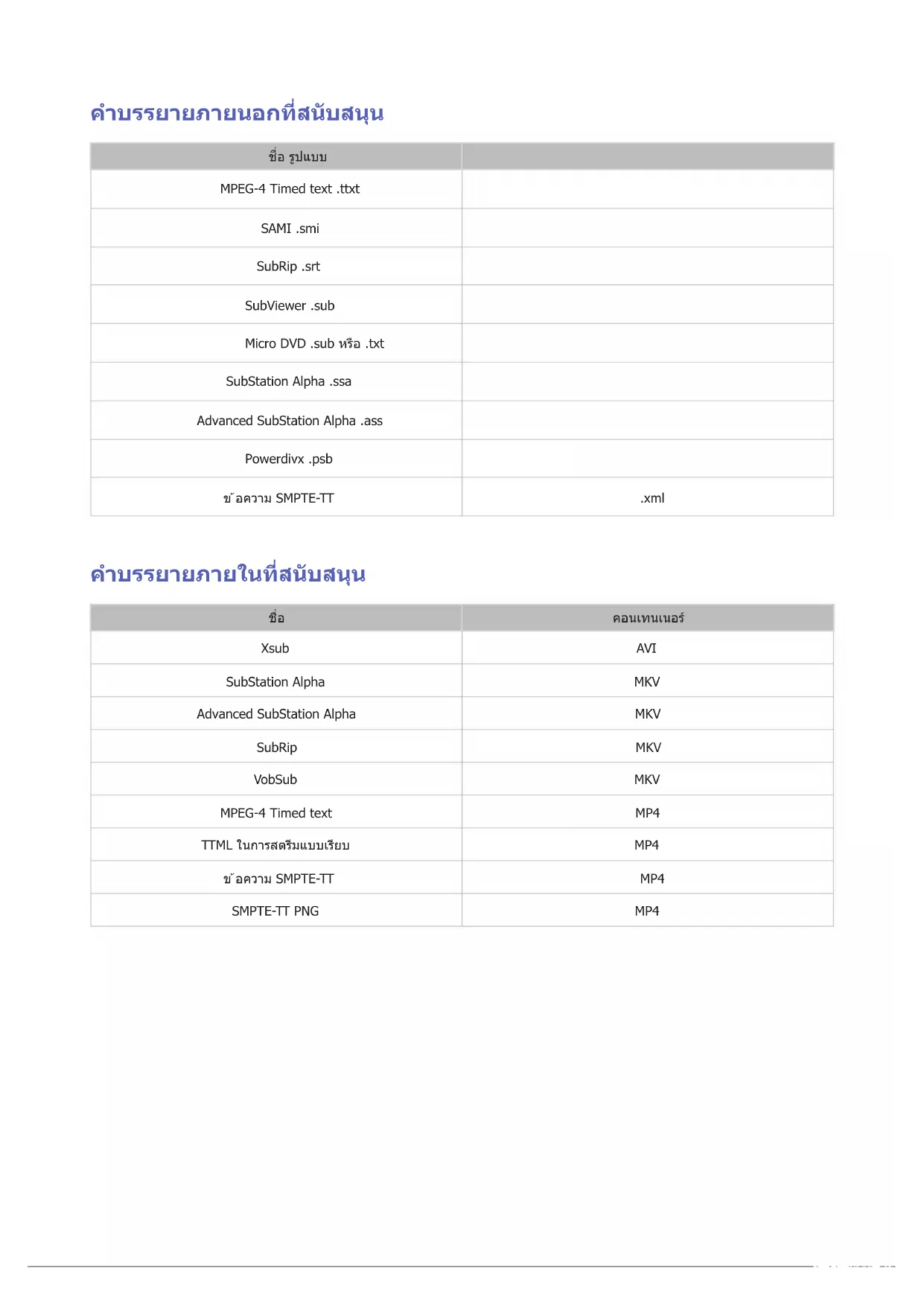 อ คอนเทนเนอร์ Xsub AVI SubStation Alpha MKV Advanced SubStation Alpha MKV SubRip MKV VobSub MKV MPEG-4 Timed text MP4 TTML ในการสตรีมแบบเรียบ MP4 ข ้อความ SMPTE-TT MP4