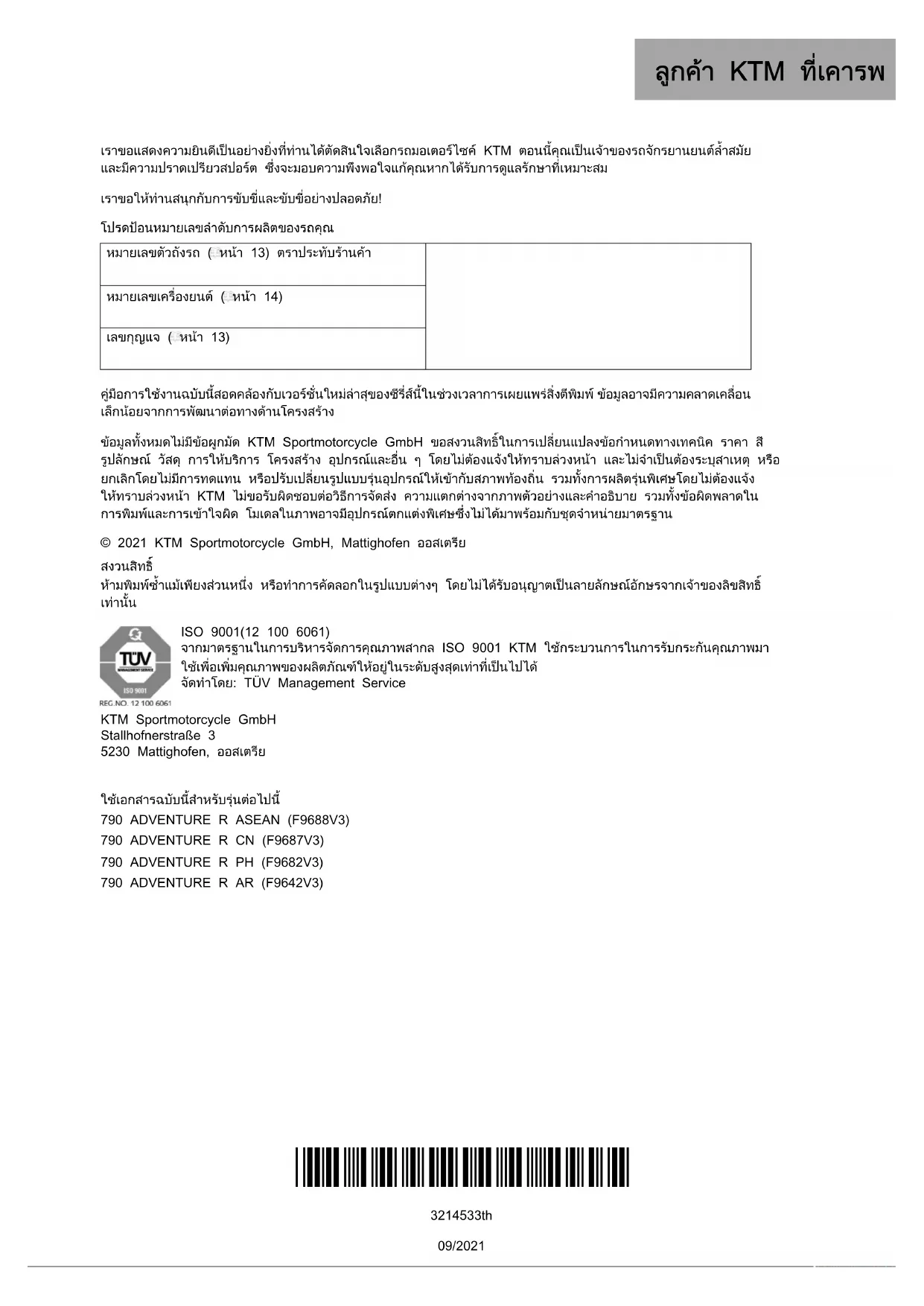 ISO 9001(12 100 6061) จากมาตรฐานในการบริหารจัดการคุณภาพสากล ISO 9001 KTM ใชกระบวนการในการรับกระกันคุณภาพมา ใชเพื่อเพิ่มคุณภาพของผลิตภัณฑใหอยูในระดับสูงสุดเทาที่เปนไปได จัดทําโดย: TÜV Management Service KTM Sportmotorcycle GmbH Stallhofnerstraße 3 5230 Mattighofen, ออสเตรีย ใชเอกสารฉบับนี้สําหรับรุนตอไปนี้ 790 ADVENTURE R ASEAN (F9688V3) 790 ADVENTURE R CN (F9687V3) 790 ADVENTURE R PH (F9682V3)