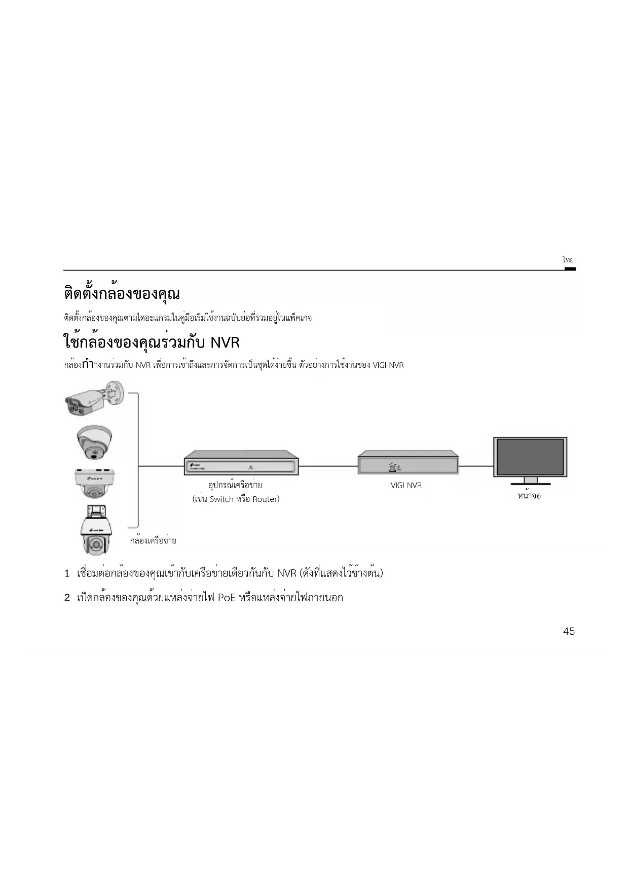 กล้องเครือข่าย 1 เชื่อมต่อกล้องของคุณเข้ากับเครือข่ายเดียวกันกับ NVR (ดังที่แสดงไว้ข้างต้น) 2 เปิดกล้องของคุณด้วยแหล่งจ่ายไฟ PoE หรือแหล่งจ่ายไฟภายนอก46