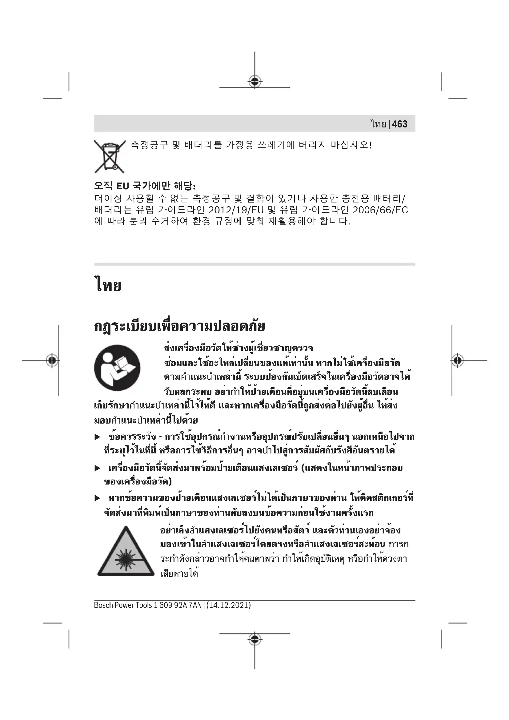 Bosch Power Tools 1 609 92A 7AN | (14.12.2021)464 | ไทย u ถ้าแสงเลเซอร์เข้าตา ต้องปิดตาและหันศีรษะออกจากลำแสงในทันที u อย่าทำการเปลี่ยนแปลงใดๆ ที่อุปกรณ์เลเซอร์ u อย่าใช้แว่นสำหรับมองแสงเลเซอร์ (อุปกรณ์เสริม) เป็นแว่นนิรภัย แว่นสำหรับมอง แสงเลเซอร์ใช้สำหรับมองลำแสงเลเซอร์ให้เห็นชัดเจนยิ่งขึ้น แต่ไม่ได้ช่วยป้องกันรังสี