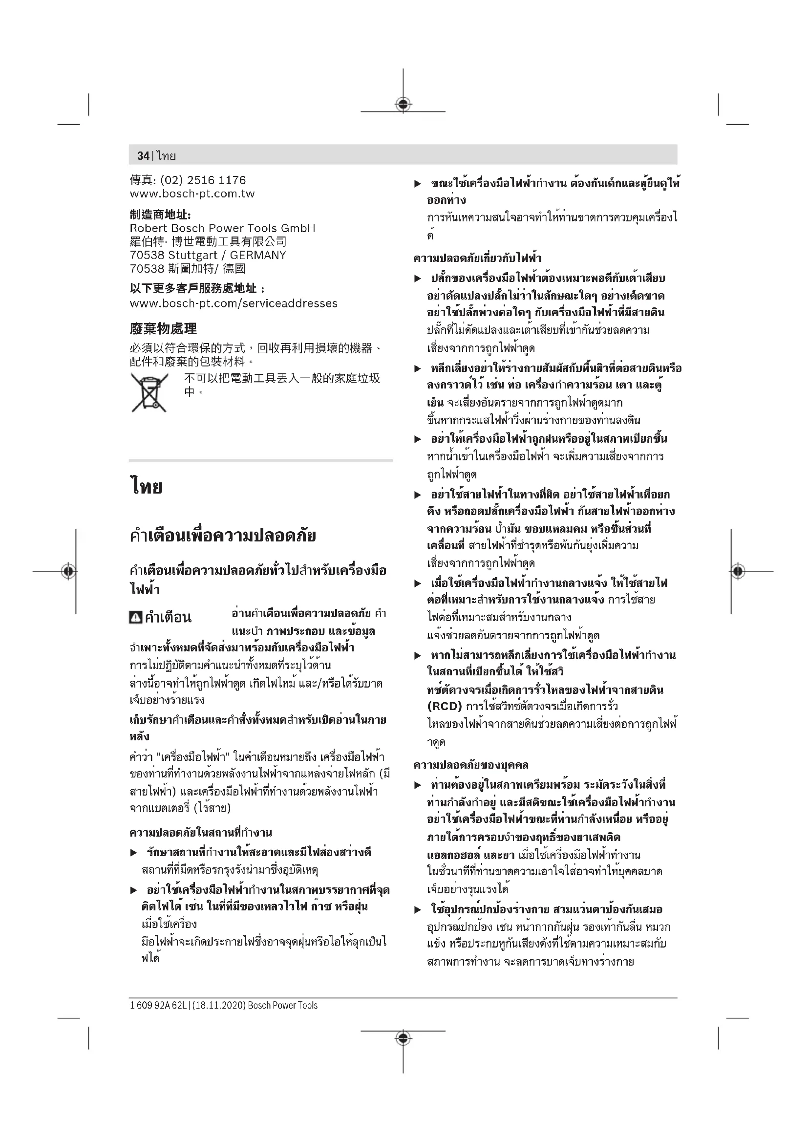 ไทย บริษัท โรเบิร์ต บ๊อช จำกัด เอฟวายไอ เซ็นเตอร์ อาคาร 1 ชั้น 5 เลขที่ 2525 ถนนพระราม 4 แขวงคลองเตย เขตคลองเตย กรุงเทพฯ 10110 โทร: +66 2012 8888 แฟกซ์: +66 2064 5800 www.bosch.co.th ศูนย์บริการซ่อมและฝึกอบรม บ๊อช อาคาร ลาซาลทาวเวอร์ ชั้น G ห้องเลขที่ 2 บ้านเลขที่ 10/11 หมู่ 16 ถนนศรีนครินทร์ ตำบลบางแก้ว อำเภอบางพลี จังหวัดสมุทรปราการ 10540