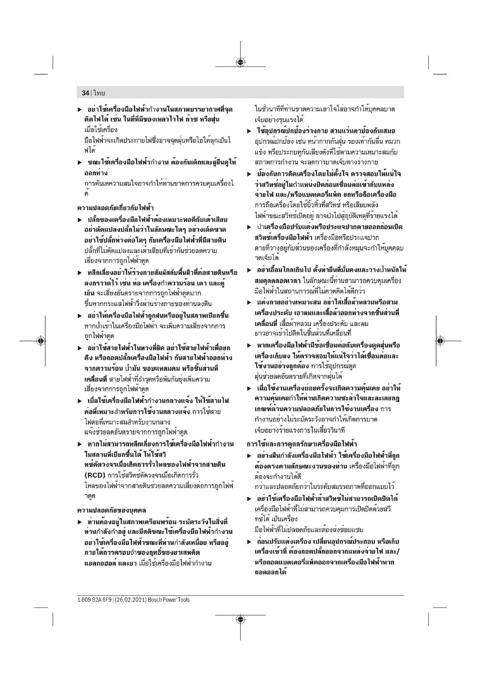 คำว่า "เครื่องมือไฟฟ้า" ในคำเตือนหมายถึง เครื่องมือไฟฟ้า ของท่านที่ทำงานด้วยพลังงานไฟฟ้าจากแหล่งจ่ายไฟหลัก (มี สายไฟฟ้า) และเครื่องมือไฟฟ้าที่ทำงานด้วยพลังงานไฟฟ้า จากแบตเตอรี่ (ไร้สาย) ความปลอดภัยในสถานที่ทำงาน u รักษาสถานที่ทำงานให้สะอาดและมีไฟส่องสว่างดี สถานที่ที่มืดหรือรกรุงรังนำมาซึ่งอุบัติเหตุ Bosch Power Tools 1 609 92A 6F9 | (26.02.2021)34 | ไทย u อย่าใช้เครื่องมือไฟฟ้าทำงานในสภาพบรรยากาศที่จุด ติดไฟได้ เช่น ในที่ที่มีของเหลวไวไฟ ก๊าซ หรือฝุ่น เมื่อใช้เครื่อง มือไฟฟ้าจะเกิดประกายไฟซึ่งอาจจุดฝุ่นหรือไอให้ลุกเป็นไ