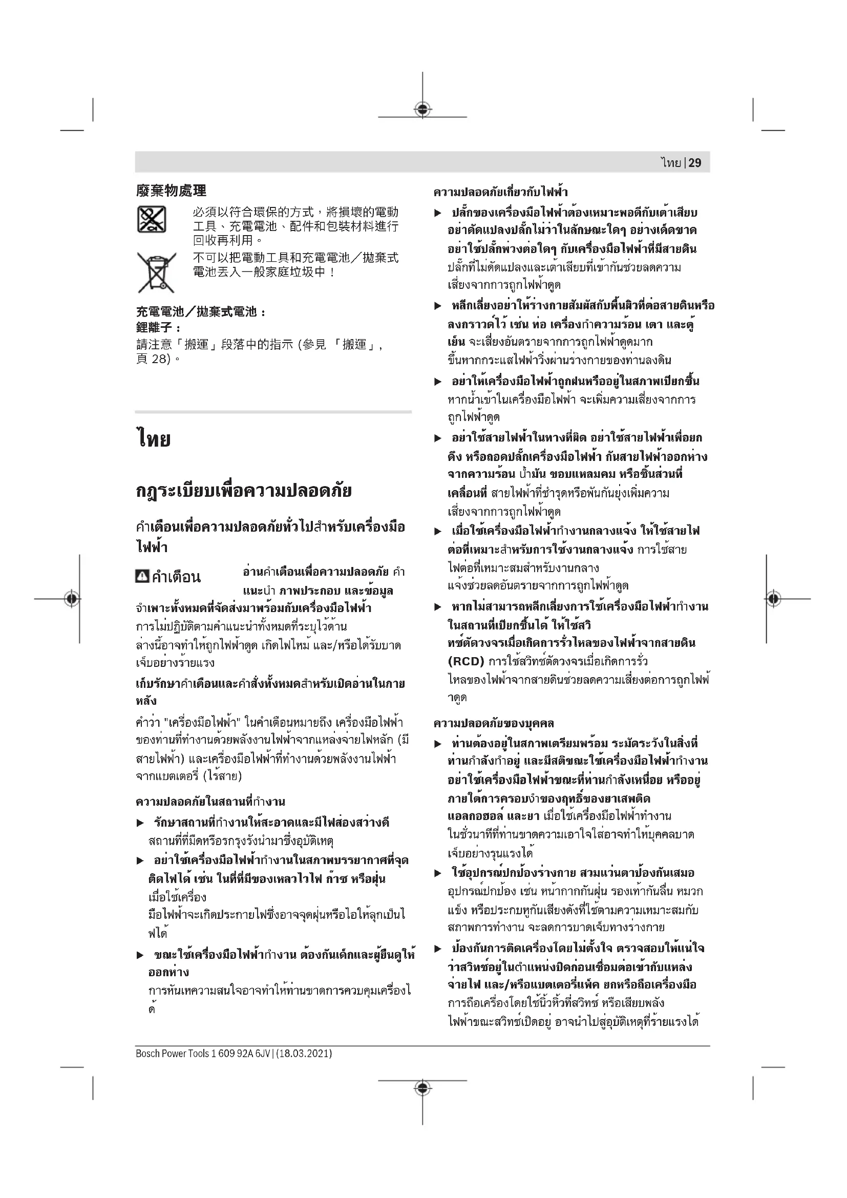 แบตเตอรี่ลิเธียม ไอออน ที่บรรจุอยู่ภาย ใต้ข้อกำหนดแห่งกฎหมายสินค้าอันตราย ผู้ ใช้สามารถขนส่งแบตเตอรี่แพ็คโดย ทางถนนโดยไม่มีข้อบังคับอื่นหากขนส่งโดยบุคคลที่สาม (เช่น : การขนส่งทางอากาศ หรือตัวแทนขนส่งสินค้า) ต้องปฏิบัติตามข้อกำหนดพิเศษเกี่ยวกับการบรรจุ 1 609 92A 6JV | (18.03.2021) Bosch Power ToolsBahasa Indonesia | 35 ภัณฑ์และการติดฉลาก สำหรับการจัดเตรียมสิ่งของที่จะจัดส่ง จำเป็นต้องปรึกษาผู้เชี่ยวชาญด้านวัตถุอันตราย ส่งแบตเตอรี่แพ็คเมื่อตัวหุ้มไม่ชำรุดเสียหายเท่านั้น ใช้แถบ กาวพันปิดหน้าสัมผัสที่เปิดอยู่ และนำแบตเตอรี่แพ็ค ใส่กล่องบรรจุโดยไม่ให้เคลื่อนไปมาในกล่องได้ นอกจาก นี้กรุณาปฏิบัติตามกฎระเบียบของประเทศซึ่งอาจมีราย ละเอียดเพิ่มเติม การกำจัดขยะ เครื่องมือไฟฟ้า แบตเตอรี่แพ็ค อุปกรณ์ประกอบ และหีบห่อ ต้องนำ ไปแยกประเภทวัสดุเพื่อนำกลับมาใช้ ใหม่โดยไม่ทำลายสภาพแวดล้อม อย่าทิ้งเครื่องมือไฟฟ้าและแบตเตอรี่แพ็ค/ แบตเตอรี่ที่นำกลับมาชาร์จใหม่ได้ ลงในขยะ