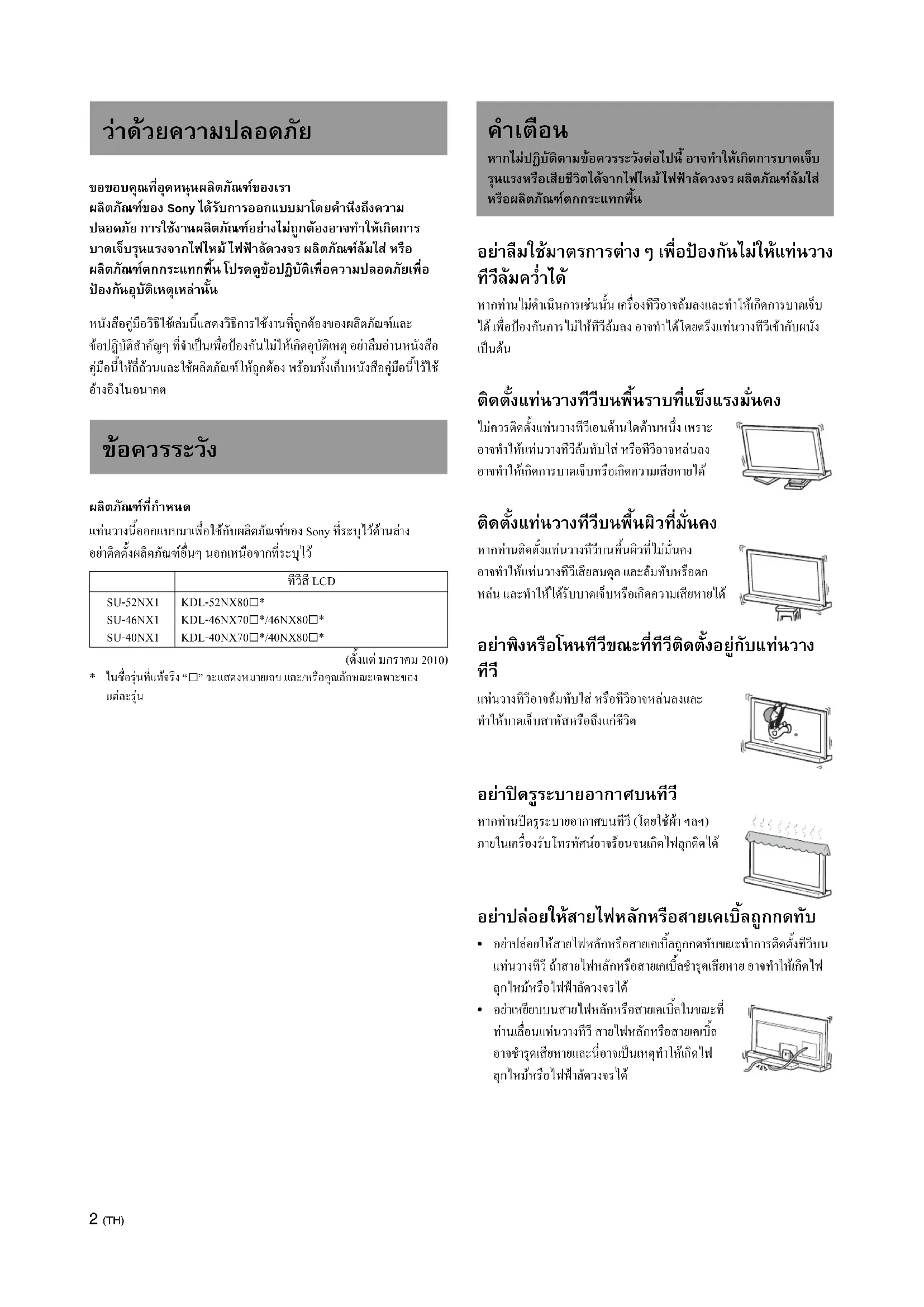 แทนวางทีวีนี้ไดรับการออกแบบสําหรับใชกับผลิตภัณฑที่ระบุไวเทานั้น หากทานติดตั้งอุปกรณอื่นนอกเหนือจากผลิตภัณฑที่ระบุไว แทนวางทีวี อาจลมหรือแตกหักชํารุดและทําใหเกิดการบาดเจ็บได ภาพที่ใชในคูมือ เลมนี้เปนของรุน KDL-40NX80s ถาไมมีการระบุไวเปนอยางอื่น อยาลืมตรึงทีวีใหอยูกับที่ ตรึงทีวีไวกับแทนวางทีวีโดยใชหมุดยึดที่ใหมา ถาไมไดติดตั้งทีวีใหตรึง อยูกับที่ ทีวีอาจตกลงมา หรือแทนวางทีวีอาจลื่นไถลลงมา และทําใหเกิด การบาดเจ็บได ขอสังเกตในการติดตั้ง ติดตั้งแทนวางทีวีบนพื้นราบที่แข็งแรงมั่นคง ระวังอยาใหแทนวางทีวีติดตั้ง แบบเฉียงๆ หรือเอียงๆ โดยทานสามารถหลีกเลี่ยงไมใหแทนวางทีวีเฉียง ๆ เอียง ๆ ไดโดยปฏิบัติตามขอแนะนําตอไปนี้ หากทานติดตั้งแทนวางทีวีบนพื้นผิวที่ออนนุม เชน บนเสื่อหรือพรม ใหนําแผนกระดานปูไวลวงหนาบนบริเวณที่กําหนดไว – อยาติดตั้งแทนวางทีวีตรงบริเวณที่โดนแดดสองโดยตรง หรืออยูใกล กับเครื่องทําความรอน – อยาติดตั้งแทนวางทีวีตรงบริเวณที่รอนหรือชื้นเกินไป หรือกลางแจง ขอสังเกตการใชงาน การทําความสะอาด ในการรักษาแทนวางทีวีใหสะอาด ใหเช็ดแทนวางทีวีดวยผาแหงนุมๆ รอยสกปรกที่ทําความสะอาดยากอาจเช็ดออกไดดวยผาชุบน้ําสบูออนๆ บิดหมาดๆ และตองเช็ดพื้นที่ดังกลาวใหแหงทันทีหลังจากนั้นดวยผาแหงนุมๆ อยาใชสารเคมีใดๆ อยางเชน ทินเนอรหรือเบนซิน เนื่องจากน้ํายาเหลานี้ จะทําลายผิวหนาวัสดุของแทนวางทีวี อยาลืมวาตองใชคน 2 คน หรือมากกวา 2 คน ติดตั้ง