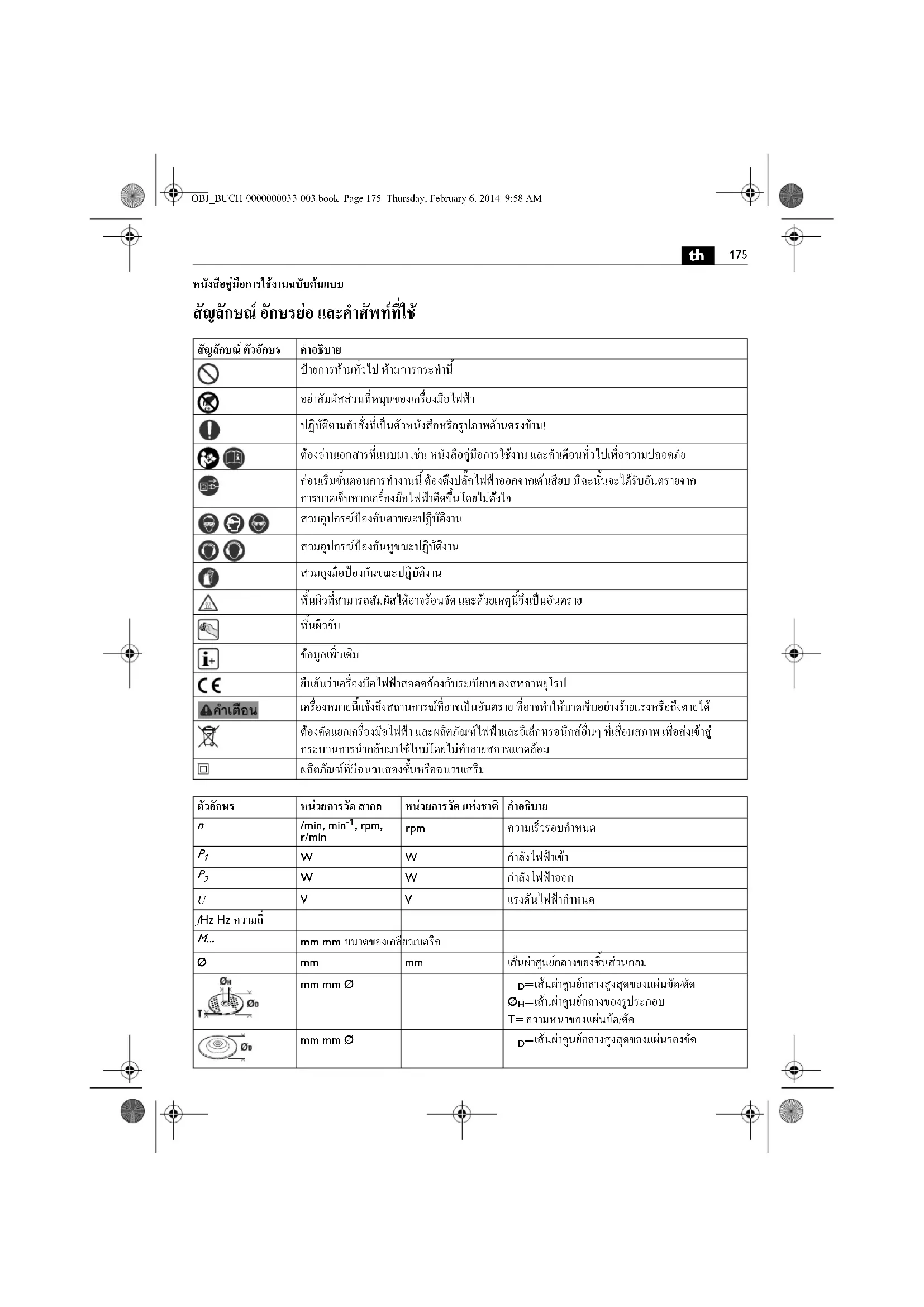 หนังสือคูมือการใชงานฉบับตนแบบ สัญลักษณ อักษรยอ และคําศัพทที่ใช สัญลักษณ ตัวอักษร คําอธิบาย ปายการหามทั่วไป หามการกระทํานี้ อยาสัมผัสสวนที่หมุนของเครื่องมือไฟฟา ปฏิบัติตามคําสั่งที่เปนตัวหนังสือหรือรูปภาพดานตรงขาม! ตองอานเอกสารที่แนบมา เชน หนังสือคูมือการใชงาน และคําเตือนทั่วไปเพื่อความปลอดภัย กอนเริ่มขั้นตอนการทํางานนี้ ตองดึงปลั๊กไฟฟาออกจากเตาเสียบ ม ิฉะนั้นจะไดรับอันตรายจาก การบาดเจ็บหากเครื่องมือไฟฟาติดขึ้นโดยไมตั งใจ สวมอุปกรณปองกันตาขณะปฏิบัติงาน สวมอุปกรณปองกันหูขณะปฏิบัติงาน สวมถุงมือปองกันขณะปฏิบัติงาน พื้นผิวที่สามารถสัมผัสไดอาจรอนจัด และดวยเหตุนี้จึงเปนอันตราย