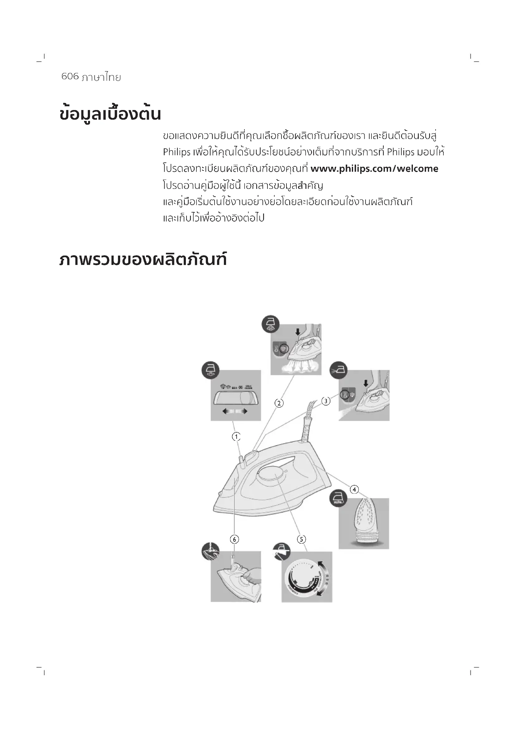ข้อมูลเบื้องต้น ขอแสดงความยินดีที่คุณเลือกซื้อผลิตภัณฑ์ของเรา และยินดีต้อนรับสู่ Philips เพื่อให้คุณได้รับประโยชน์อย่างเต็มที่จากบริการที่ Philips มอบให้ โปรดลงทะเบียนผลิตภัณฑ์ของคุณที่ www.philips.com/welcome โปรดอ่านคู่มือผู้ใช้นี้ เอกสารข้อมูลสำคัญ และคู่มือเริ่มต้นใช้งานอย่างย่อโดยละเอียดก่อนใช้งานผลิตภัณฑ์ และเก็บไว้เพื่ออ้างอิงต่อไป ภาพรวมของผลิตภัณฑ์