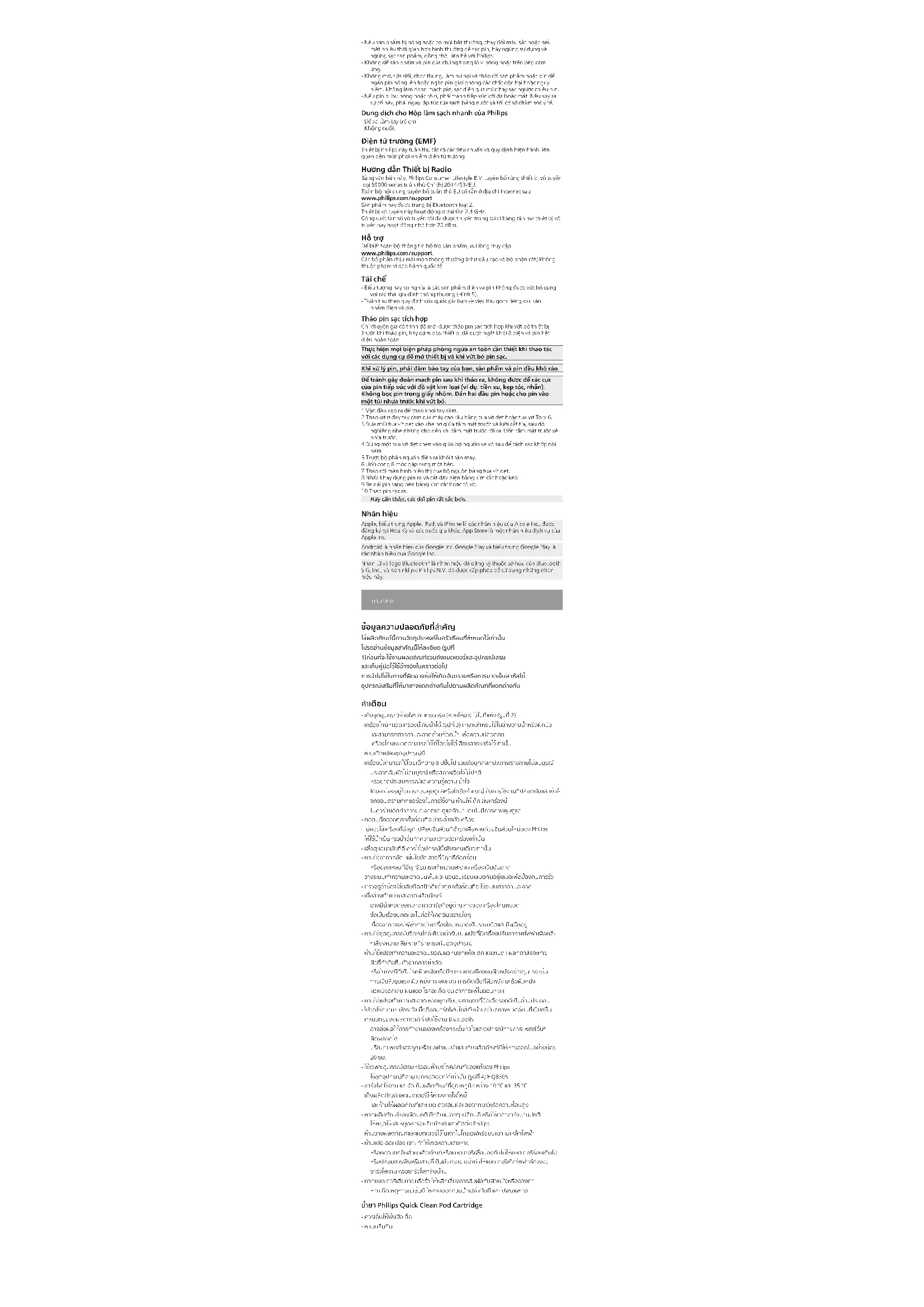 ปรึกษาแพทย์ของคุณเพื่อขอคําแนะนําและเก็บผลิตภัณฑ์นี้ให้ห่างออกไปอย่างน้อย 20ซม. - ใช้เฉพาะอุปกรณ์เสริมหรือสินค้าบริโภคภัณฑ์ของแท้ของ Philips ใช้ชุดอุปกรณ์ที่สามารถถอดออกได้เท่านั้น (รูปที่ 4) HQ8505 - ชาร์จไฟ ใช้งาน และจัดเก็บผลิตภัณฑ์ที่อุณหภูมิระหว่าง 10°C และ 35°C - เก็บผลิตภัณฑ์และแบตเตอรี่ให้ห่างจากไฟไหม้ และห้ามให้ผลิตภัณฑ์และแบตเตอรี่สัมผัสแสงอาทิตย์หรือความร้อนสูง - หากผลิตภัณฑ์ร้อนผิดปกติ มีกลิ่นแปลกๆ เปลี่ยนสี หรือใช้เวลาชาร์จนานปกติ ให้หยุดใช้และหยุดชาร์จผลิตภัณฑ์ แล้วติดต่อ Philips - ห้ามวางผลิตภัณฑ์และแบตเตอรี่ไว้ในเตาไมโครเวฟหรือบนเตาแม่เหล็กไฟฟ้า - ห้ามเปิด ดัดแปลง เจาะ ทำให้เกิดความเสียหาย หรือถอดแยกชิ้นส่วนผลิตภัณฑ์หรือแบตเตอรี่เพื่อป้องกันไม่ให้แบตเตอรี่ร้อนเกินไป หรือปล่อยสารพิษหรือสารที่เป็นอันตราย อย่าทำให้แบตเตอรี่เกิดไฟฟ้าลัดวงจร ชาร์จไฟเกิน หรือชาร์จไฟกลับด้าน - หากแบตเตอรี่เสียหายหรือรั่ว ให้หลีกเลี่ยงการสัมผัสกับผิวหนังหรือดวงตา หากเกิดเหตุการณ์เช่นนี้ ให้ล้างออกด้วยน้ำเปล่าทันที และไปพบแพทย์ น้ำยา Philips Quick Clean Pod Cartridge - ควรเก็บให้พ้นมือเด็ก - ห้ามกลืนกินสนามแม่เหล็กไฟฟ้า (EMF) อุปกรณ์ Philips เครื่องนี้สอดคล้องกับมาตรฐานและกฎข้อบังคับที่เกี่ยวข้องทั้งหมดเกี่ยวกับการสัมผั สกับสนามแม่เหล็กไฟฟ้า ข้อกำหนดอุปกรณ์วิทยุ Philips Consumer Lifestyle B.V. ประกาศ ณ ที่นี้ว่าอุปกรณ์วิทยุประเภทซีรีส์ S9000 สอดคล้องกับข้อกำหนด 2014/53/EU ข้อความเกี่ยวกับประกาศเรื่องความสอดคล้องกับ EU ทั้งหมดจะแสดงอยู่ในที่อยู่อินเทอร์เน็ตต่อไปนี้: www.philips.com/support ผลิตภัณฑ์นี้ใช้ Bluetooth ระดับ 2 ช่วงความถี่ที่อุปกรณ์วิทยุทำงานอยู่คือ 2.4GHz กำลังความถี่วิทยุสูงสุดที่แผ่กระจายออกมาในช่วงความถี่ที่อุปกรณ์วิทยุทำงานอยู่จะ น้อยกว่า 20dBm ฝ่ายสนับสนุน สำหรับข้อมูลการสนับสนุนของผลิตภัณฑ์ทั้งหมด โปรดไปที่ www.philips.com/support ชิ้นส่วนที่สึกหรอตามปกติ (เช่น หัวโกนและใบมีด) ไม่ครอบคลุมในการรับประกันระหว่างประเทศ การรีไซเคิล - สัญลักษณ์นี้หมายความว่า คุณจะต้องไม่นำผลิตภัณฑ์ไฟฟ้าและแบตเตอรี่ไปทิ้งรวมกับขยะภายในบ้านทั่วไป (รูปที่ 5) - ปฏิบัติตามกฎภายในประเทศของคุณสำหรับการคัดแยกผลิตภัณฑ์ไฟฟ้าและแบตเต