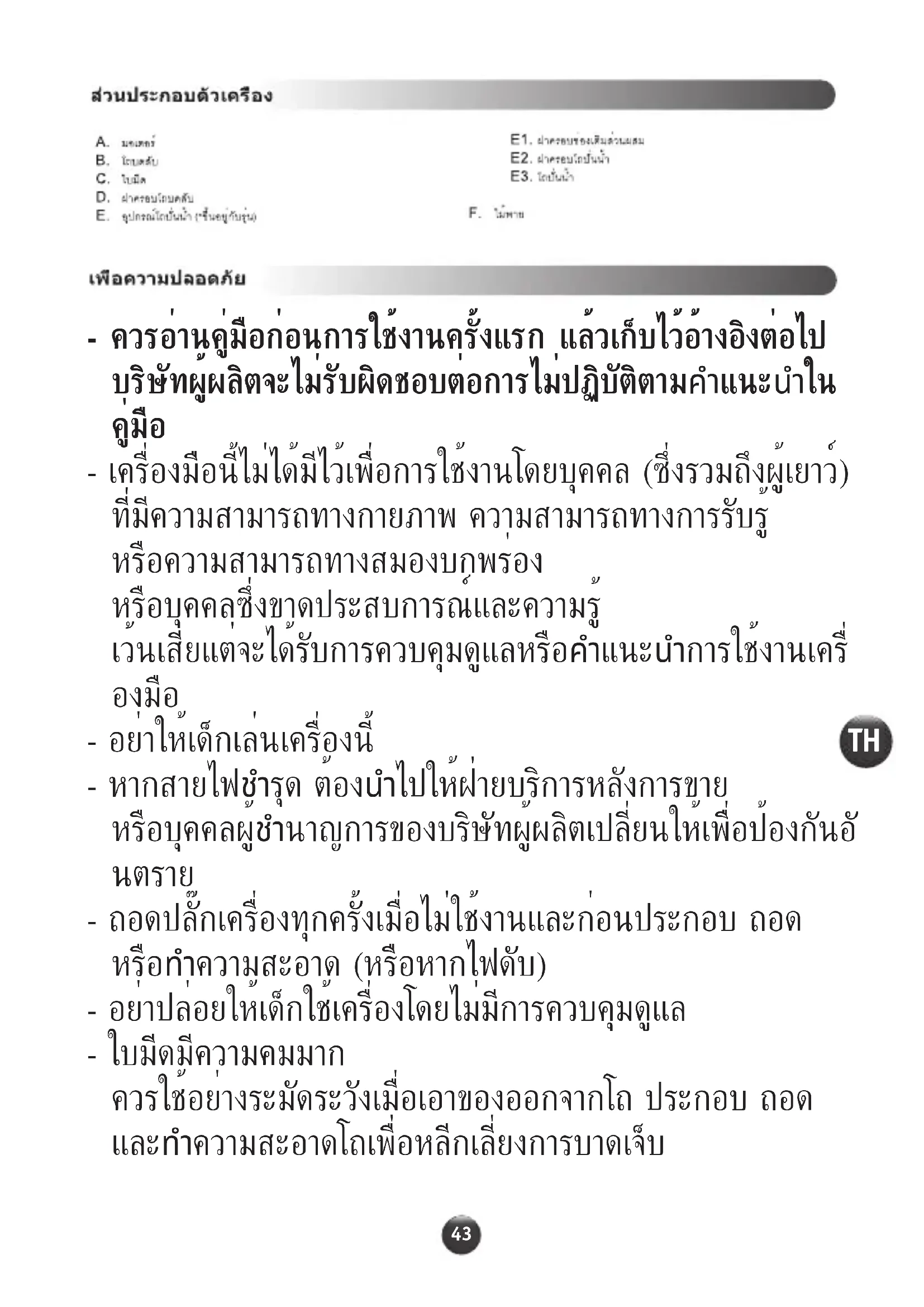 อยู่เหนือโถและชิ้นส่วนขณะกำลังทำงาน. -ดูคำแนะนำการตั้งความเร็วและเวลาทำงานเครื่อง -ดูคำแนะนำในการทำความสะอาดและบำรุงรักษาเครื่อง โดยเฉพาะอุปกรณ์ที่สัมผัสกับอาหาร -ดูคำแนะนำการประกอบและถอดชิ้นส่วนเครื่อง -ปิดเครื่องแล้วถอดปลั๊กก่อนเปลี่ยนชิ้นส่วนหรือดำเนินการใดๆ กับส่วนที่เคลื่อนที่เมื่อเครื่องทำงาน -การใช้ที่ไม่ถูกต้องอาจก่อให้เกิดอาการบาดเจ็บได้ สำหรับวางจำหน่ายในยุโรปเท่านั้น -ไม่ควรให้เด็กใช้เครื่องนี้ -วางอุปกรณ์และสายให้ห่างจากมือเด็ก -บุคคลผู้มีความสามารถทางกายภาพความสามารถทางการรับรู้ หรือความสามารถทางสมองบกพร่อง หรือบุคคลซึ่งขาดประสบการณ์และความรู้ สามารถใช้เครื่องนี้ได้โดยต้องได้รับการดูแลและการแนะนำในก ารใช้เครื่องอย่างปลอดภัย และให้มีความเข้าใจถึงอันตรายที่อาจเกิดขึ้นได้ -ควรระมัดระวังอย่าให้เด็กเล่นเครื่อง 8080015206_Moulinette_SM_Mise en page 1 02/07/15 10:13 Page4546