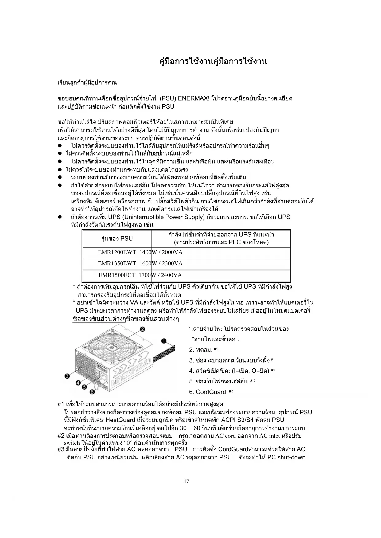 #1 เพื่อใหระบบสามารถระบายความรอนไดอยางมีประสิทธิภาพสูงสุด โปรดอยาวางสิ่งของกีดขวางชองดูดลมของพัดลม PSU และบริเวณชองระบายความรอน อุปกรณ PSU นี้มีฟงกชั่นพิเศษ HeatGuard เมื่อระบบถูกปด หรือเขาสูโหมดพัก ACPI S3/S4 พัดลม PSU จะทําหนาที่ระบายความรอนที่เหลืออยู ตอไปอีก 30 ~ 60 วินาที เพื่อชวยยืดอายุการทํางานของระบบ #2 เมื่อทานตองการประกอบหรือตรวจสอบระบบ กรุณาถอดสาย AC cord ออกจาก AC inlet หรือปรับ switch ใหอยูในตําแหนง “0” กอนดําเนินการทุกครั้ง