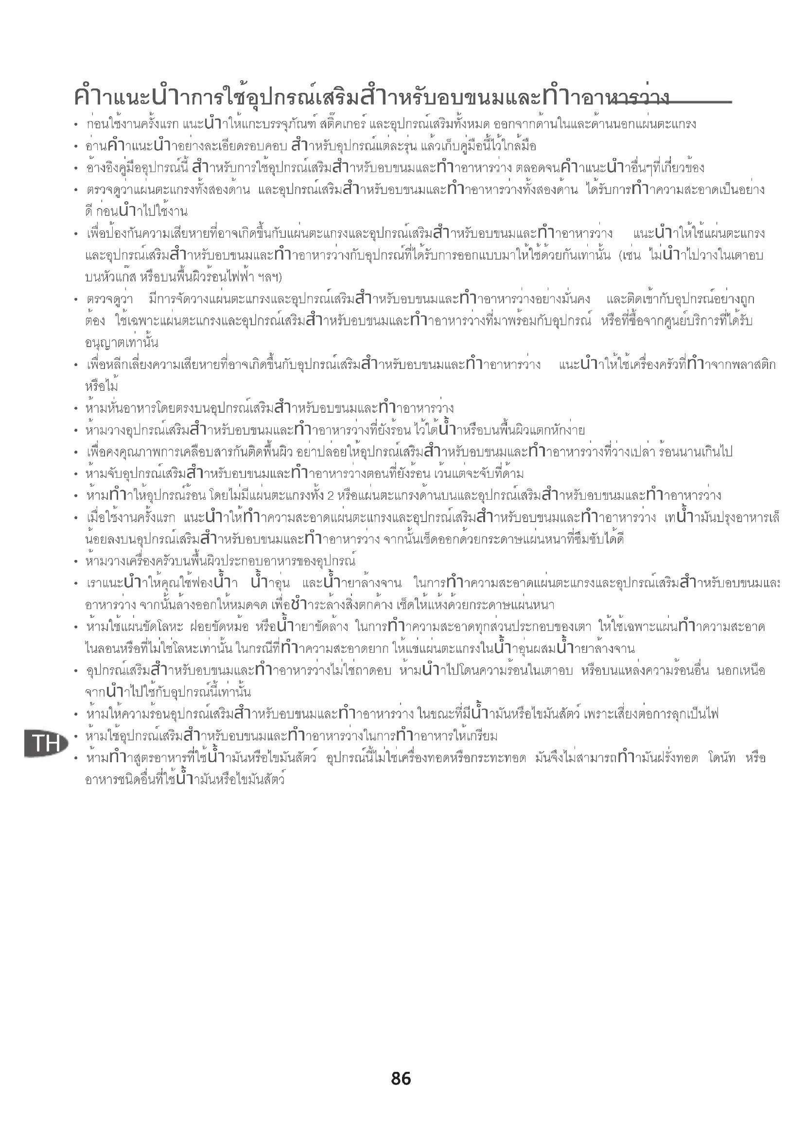 - ห้ามทำาสูตรอาหารที่ใช้น้ำามันหรือไขมันสัตว์ อุปกรณ์นี้ไม่ใช่เครื่องทอดหรือกระทะทอด มันจึงไม่สามารถทำามันฝรั่งทอด โดนัท หรือ อาหารชนิดอื่นที่ใช้น้ำามันหรือไขมันสัตว์87