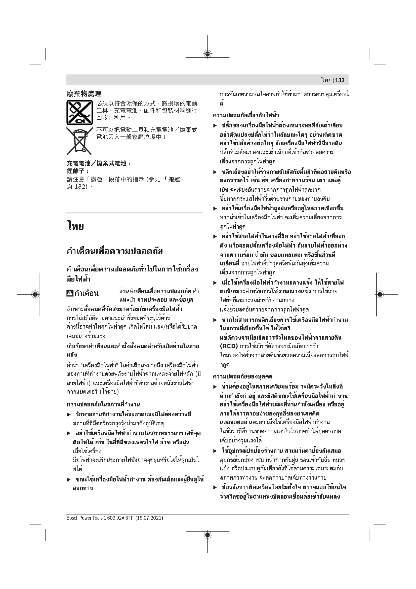 แบตเตอรี่ลิเธียม ไอออน ที่บรรจุอยู่ภาย ใต้ข้อกำหนดแห่งกฎหมายสินค้าอันตราย ผู้ ใช้สามารถขนส่งแบตเตอรี่แพ็คโดย ทางถนนโดยไม่มีข้อบังคับอื่นหากขนส่งโดยบุคคลที่สาม (เช่น : การขนส่งทางอากาศ หรือตัวแทนขนส่งสินค้า) ต้องปฏิบัติตามข้อกำหนดพิเศษเกี่ยวกับการบรรจุ ภัณฑ์และการติดฉลาก สำหรับการจัดเตรียมสิ่งของที่จะจัดส่ง จำเป็นต้องปรึกษาผู้เชี่ยวชาญด้านวัตถุอันตราย ส่งแบตเตอรี่แพ็คเมื่อตัวหุ้มไม่ชำรุดเสียหายเท่านั้น ใช้แถบ กาวพันปิดหน้าสัมผัสที่เปิดอยู่ และนำแบตเตอรี่แพ็ค ใส่กล่องบรรจุโดยไม่ให้เคลื่อนไปมาในกล่องได้ นอกจาก นี้กรุณาปฏิบัติตามกฎระเบียบของประเทศซึ่งอาจมีราย ละเอียดเพิ่มเติม การกำจัดขยะ เครื่องมือไฟฟ้า แบตเตอรี่แพ็ค อุปกรณ์ประกอบ และหีบห่อ ต้องนำ ไปแยกประเภทวัสดุเพื่อนำกลับมาใช้ ใหม่โดยไม่ทำลายสภาพแวดล้อม อย่าทิ้งเครื่องมือไฟฟ้าและแบตเตอรี่แพ็ค/ แบตเตอรี่ที่นำกลับมาชาร์จใหม่ได้ ลงในขยะ