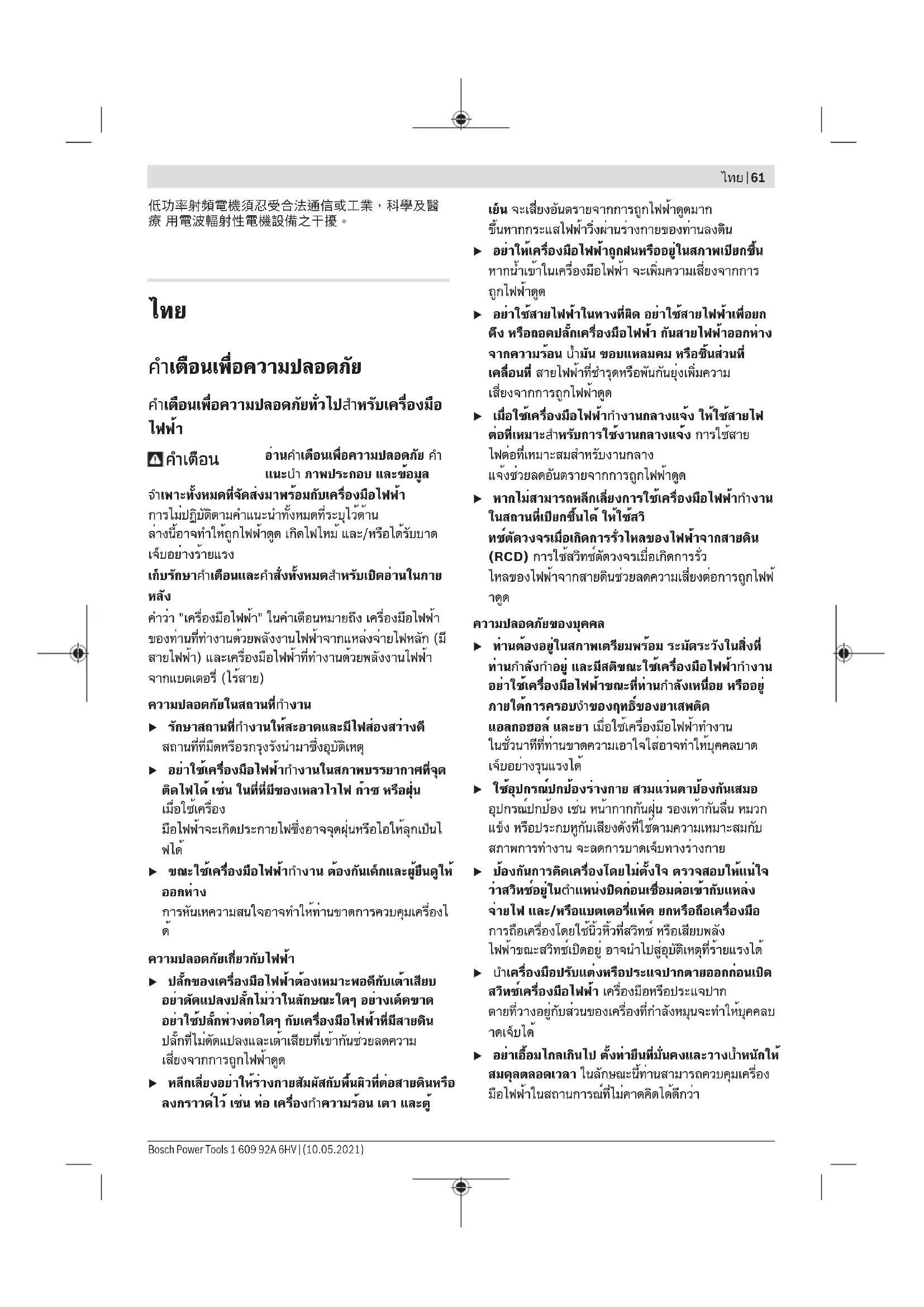 ความปลอดภัยเกี่ยวกับไฟฟ้า u ปลั๊กของเครื่องมือไฟฟ้าต้องเหมาะพอดีกับเต้าเสียบ อย่าดัดแปลงปลั๊กไม่ว่าในลักษณะใดๆ อย่างเด็ดขาด อย่าใช้ปลั๊กพ่วงต่อใดๆ กับเครื่องมือไฟฟ้าที่มีสายดิน ปลั๊กที่ไม่ดัดแปลงและเต้าเสียบที่เข้ากันช่วยลดความ เสี่ยงจากการถูกไฟฟ้าดูด u หลีกเลี่ยงอย่าให้ร่างกายสัมผัสกับพื้นผิวที่ต่อสายดินหรือ ลงกราวด์ไว้ เช่น ท่อ เครื่องทำความร้อน เตา และตู้ เย็น จะเสี่ยงอันตรายจากการถูกไฟฟ้าดูดมาก ขึ้นหากกระแสไฟฟ้าวิ่งผ่านร่างกายของท่านลงดิน u อย่าให้เครื่องมือไฟฟ้าถูกฝนหรืออยู่ในสภาพเปียกชื้น หากน้ำเข้าในเครื่องมือไฟฟ้า จะเพิ่มความเสี่ยงจากการ ถูกไฟฟ้าดูด u อย่าใช้สายไฟฟ้าในทางที่ผิด อย่าใช้สายไฟฟ้าเพื่อยก ดึง หรือถอดปลั๊กเครื่องมือไฟฟ้า กันสายไฟฟ้าออกห่าง จากความร้อน น้ำมัน ขอบแหลมคม หรือชิ้นส่วนที่ เคลื่อนที่ สายไฟฟ้าที่ชำรุดหรือพันกันยุ่งเพิ่มความ เสี่ยงจากการถูกไฟฟ้าดูด u เมื่อใช้เครื่องมือไฟฟ้าทำงานกลางแจ้ง ให้ใช้สายไฟ ต่อที่เหมาะสำหรับการใช้งานกลางแจ้ง การใช้สาย ไฟต่อที่เหมาะสมสำหรับงานกลาง แจ้งช่วยลดอันตรายจากการถูกไฟฟ้าดูด u หากไม่สามารถหลีกเลี่ยงการใช้เครื่องมือไฟฟ้าทำงาน ในสถานที่เปียกชื้นได้ ให้ใช้สวิ ทช์ตัดวงจรเมื่อเกิดการรั่วไหลของไฟฟ้าจากสายดิน (RCD) การใช้สวิทช์ตัดวงจรเมื่อเกิดการรั่ว ไหลของไฟฟ้าจากสายดินช่วยลดความเสี่ยงต่อการถูกไฟฟ้