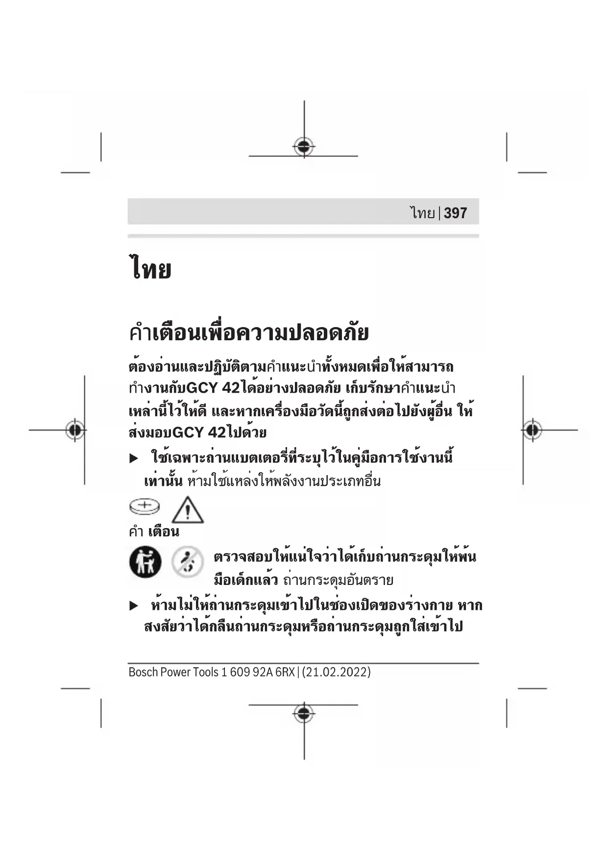ตรวจสอบให้แน่ใจว่าได้เก็บถ่านกระดุมให้พ้น มือเด็กแล้ว ถ่านกระดุมอันตราย u ห้ามไม่ให้ถ่านกระดุมเข้าไปในช่องเปิดของร่างกาย หาก สงสัยว่าได้กลืนถ่านกระดุมหรือถ่านกระดุมถูกใส่เข้าไป Bosch Power Tools 1 609 92A 6RX | (21.02.2022)398 | ไทย ในช่องเปิดของร่างกาย ให้รีบไปพบแพทย์ทันที การกลืน ถ่านกระดุมสามารถทำให้เกิดแผลไหม้ภายในอย่างรุนแรง ภายใน 2 ชั่วโมงและอาจนำไปสู่ความตายได้ u เมื่อเปลี่ยน ให้ตรวจสอบให้แน่ใจว่าได้เปลี่ยนถ่านกระดุม อย่างถูกต้อง อันตรายจากการระเบิด u ใช้เฉพาะถ่านกระดุมที่ระบุไว้ในคู่มือการใช้งานนี้เท่านั้น อย่าใช้ถ่านกระดุมอื่นๆ หรือแหล่งให้พลังงานประเภทอื่น u อย่าพยายามชาร์จถ่านกระดุมอีกครั้ง และอย่าลัดวงจร ถ่านกระดุม ถ่านกระดุมอาจรั่วไหล ระเบิด เผาไหม้ และ ทำให้บุคคลบาดเจ็บได้ u นำถ่านกระดุมที่หมดไฟแล้วออกมา และนำไปกำจัดอย่าง ถูกต้อง ถ่านกระดุมที่หมดไฟแล้วอาจรั่วไหล และส่งผลเสีย หายต่อผลิตภัณฑ์หรือทำให้บุคคลบาดเจ็บได้ u อย่าให้ถ่านกระดุมร้อนมากเกินไป และอย่าโยนเข้ากอง ไฟ ถ่านกระดุมอาจรั่ว ระเบิด ไหม้ และทำให้บุคคลบาดเจ็บ