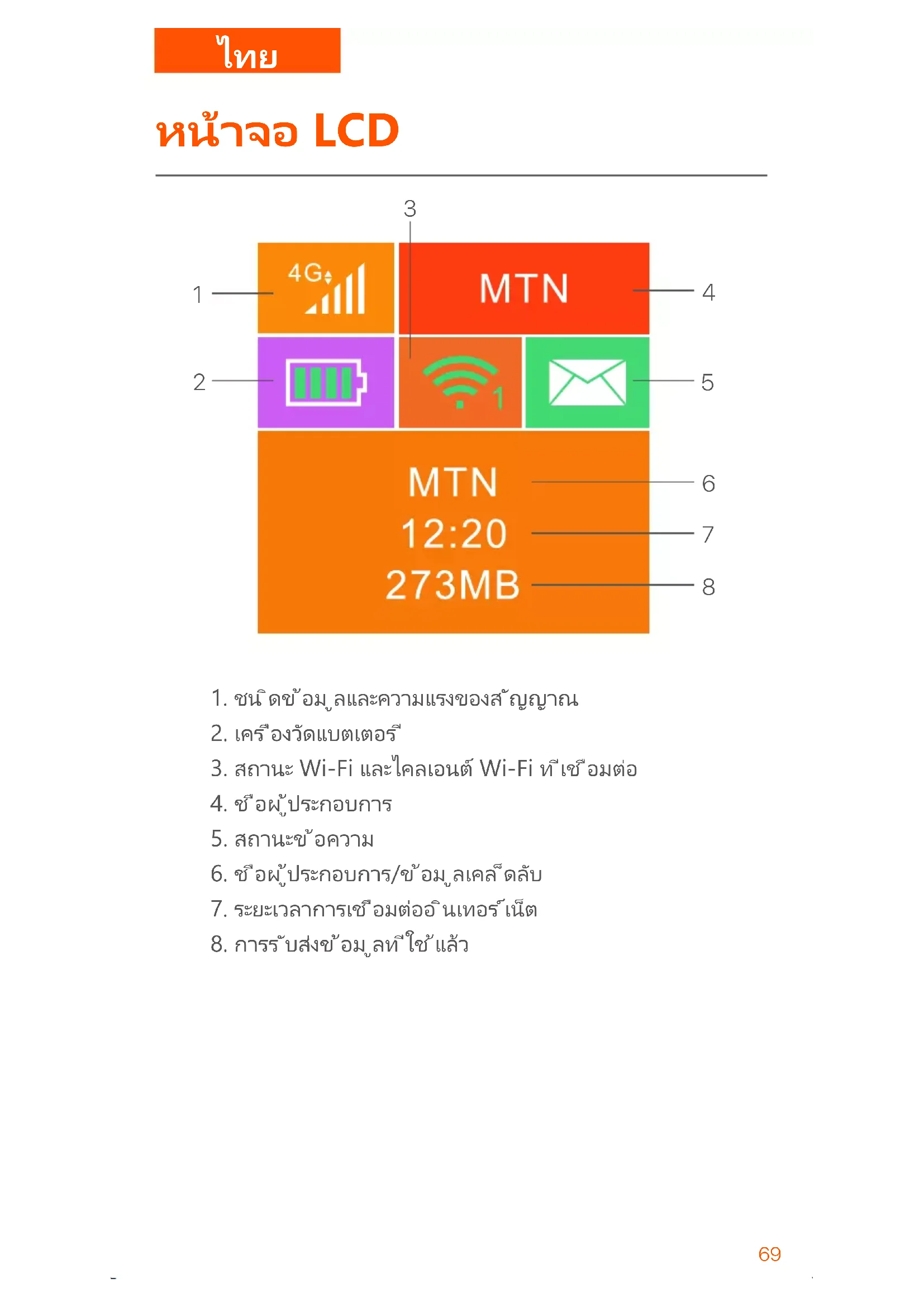 กดปุ่ม จนกว่าหน้าจอ LCD จะสว่างข ึ ้น เม ื่อฮอตสปอตเช ื่อมต่อกับอ ินเทอร ์เน็ต คุณจะพบ: หากฮอตสปอตไม่ได้เช ื่อมต่อกับอ ินเทอร ์เน ็ตเป ็นเวลานาน ให้ดู Q1 ใน FAQ เคล็ดลับไทย