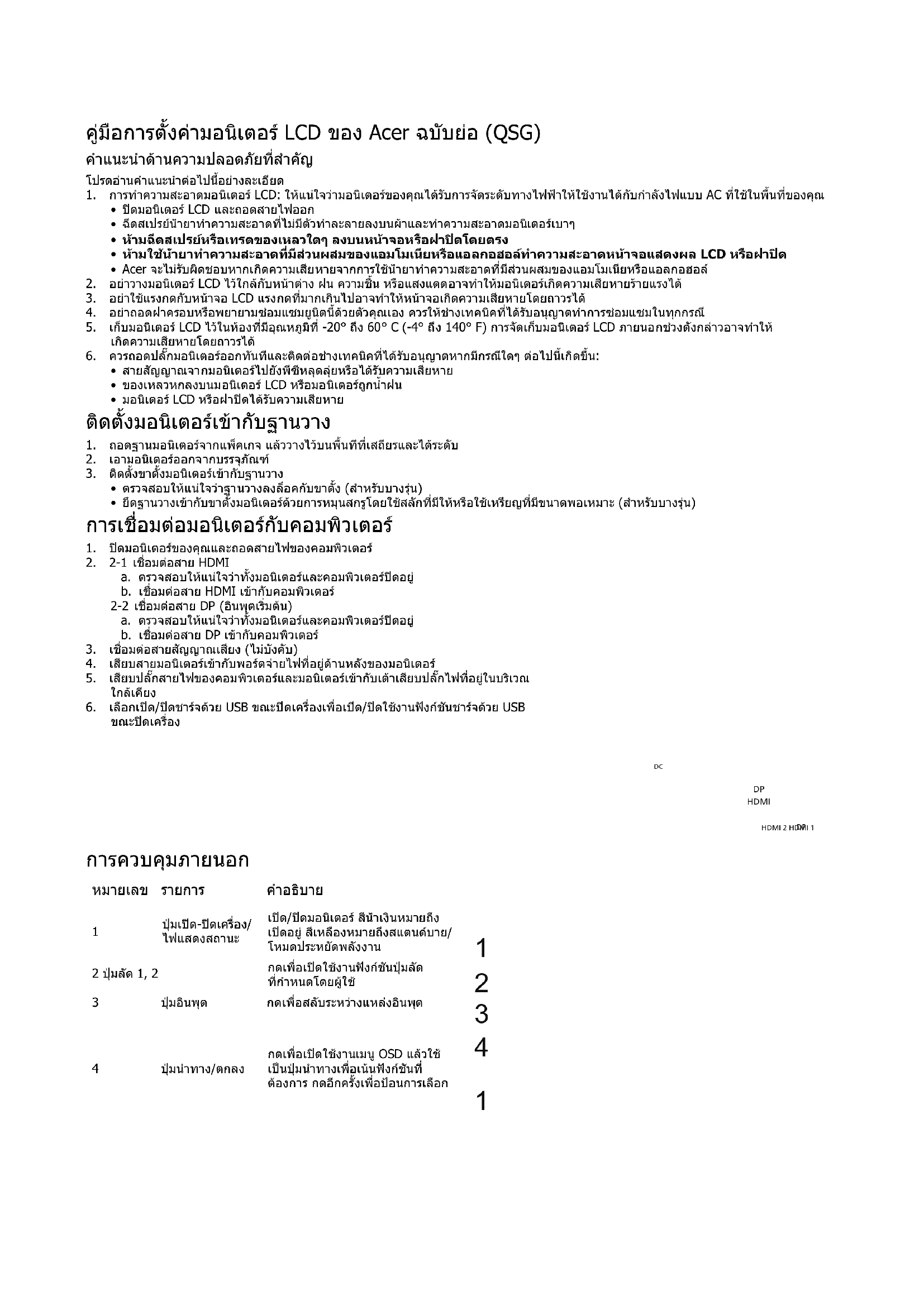 - Acer จะไมรับผิดชอบหากเกิดความเสียหายจากการใชน้ํายาทําความสะอาดที่มีสวนผสมของแอมโมเนียหรือแอลกอฮอล